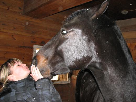 осенью 2005 году к нам на конюшню поставили частного коника!Русский рысак 3х лет караковой масти.Девушка для которой купили жила в Москве.А ее подруга ,которая выбирала и покупала коня живет у нас в городе.Вот коника привезли к нами через некоторое время я стала с ним заниматься когда хозяйка не могла приезжать.Парус был с характером,мог и посвечить в руках!Но в езде был нормальным абсолютно,только спотыкался постоянно.Мы на нем даже манеж боронили(он раньше в качалке бегал).Особой привязанности я к нему не испытывала,т.к знала что его рано или поздно увезут в Москву.Ближе к лету 2006 наши занятия стали все реже,т.к темнело позже и хозяйка часто приезжала после работы.Если честно мне ничего особого не запомнилось в работе с ним.Правда мне подарили обалденный недоуздок за то что я с ним занимаюсь.Кстати качество настолько хорошее что ему уже 4 года ,а он как новый!Ну осенью произошли обстоятельства описаные ранее и Паруса срочно пришлось вывозить в Москву.Дальнейшую его жизнь я узнавала от подруги.Его там кастрировали,он стал ласковым и спокойным.Думала больше и не увидимся,когда в прошлом году мне позвонила хозяйка Руськи и попросила взять его к себе на постой.Мы как раз начали конюшню строить.В силу некоторых обстоятельств у них небыло средств оплачивать постой лошарика.К тому же у Паруса случились неприятности с копытами.На обоих передних копытах от венчика вниз образовались кровоточашие трещины.Конь перенес много лечебных процедур,ортопедическую ковку. Как только врач разрешил перевозку коня он переехал ко мне.Это случилось 20 апреля 2010 года!Если честно переезд долго откладывали,мы ждали его еще в октябре.Но получилось только в апреле.В марте кстати я ездила к нему в гости.Выложу фотки.