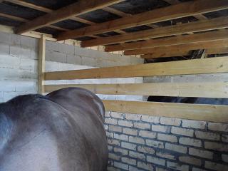 Сено нам уже привезли.Такое классное луговое(хоть сама жуй :wink: ).Под деревьями лазию яблоки паданые собираю коням,каждый день свежие витаминки.У нас между конями перегородка деревяння и обитая линолиумом ,чтоб не занозились.Так Парус свою сторону уже почти всю разодрал, уже доски отрывать начал.Вот заставила мужа кирпичом выкладывать перегородку.Думаю в выходные сделаем уже.Парус разрушитель.У него 2 бревна лежат чтоб грызть,мячик,бутылка висит и сено ложу в репутух.А эта ПАДЛА все равно конюшню крушит!!!