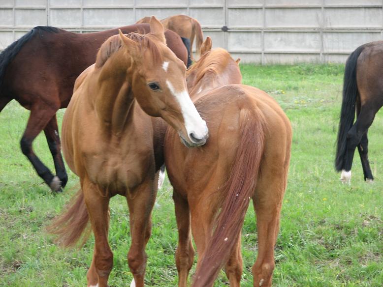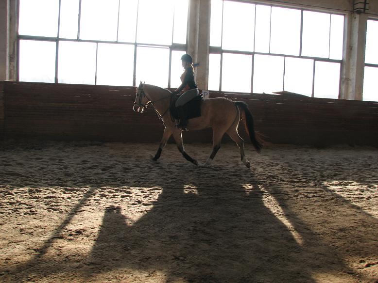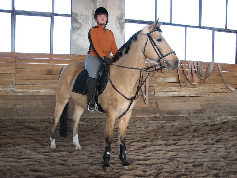Пошла чистить Спирита.Пришло вдохновение -заплела ему гриву.Вычистила, подседлала ,вручила Ольге(ветфельдшер) фотик и покорять манеж :wink: .Находясь под впечатлением вчерашнего просмотра Олимпийского КЮРа,решила из Спирита сделать "выездючного" коня. 8) Вообще то он способный ,гибкий,хорошо отзывается на шенкель,сбор тоже неплохой.НО ко всему этому Сема ПУГЛИВЫЙ!!!! Сегодня мы отработали хорошо(не считая того раза когда другая лошадка подыграла на корде,а Спирит решил что срочно надо спасаться!!!! :shock: )Нуда ладно.Я уже привыкла...Вообще мы сегодня сделали хорошую собраную рысь и неплохой собраный галоп.Пару раз делали прибавку ,но у меня почему то всегда стремена спадают на прибавленой рыси.Почему :?: :? Потом пришел прокат и мне пришлось закончить занятие,а то Спирит шуганется разок в сторону,а они посыпяться с коней!!(прецендент был :) )День прошел не зря!!!!(прошу прощенья за какчество фоток)