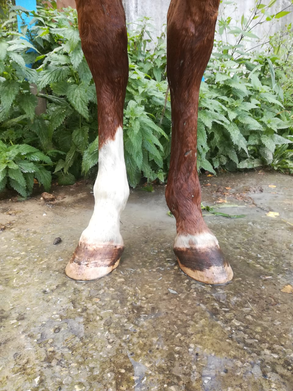 Синяки и на передней и на задней ноге. Ничего не менялось ??Очень похоже на синяки, но позавчера этого не было. Сегодня я попросила заснять кто был на конюшни. Завтра приеду посмотрю сама.