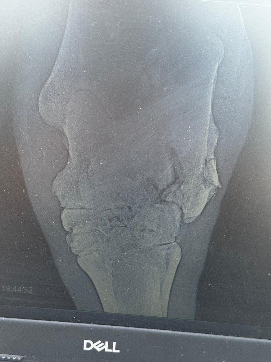 Перелом оскольчатый,сам по себе скорее всего не зарастёт.Осколки будут смещаться и вызывать постоянное воспаление и конечно боль...Загипсовать не получится,но возможно наложение тугой повязки(флисовые бинты в вашем случае вообще не о чём!).В любом случае нужны противовоспалительные препараты,препараты кальция(возможно тилдрен или осфос), успокоительные на весь период срастания перелома,диета,покой,минимальная нагрузка на ногу(не крутить,не вертеть).Опять же возраст лошади играет большую роль... Конечно нужно консультироваться с хирургами/ортопедами в крупных клиниках.Но на мой взгляд нужно оперировать и удалять осколки.Это риск!Но без операции лошадь может сама доломать себе сустав любым неаккуратным движением...