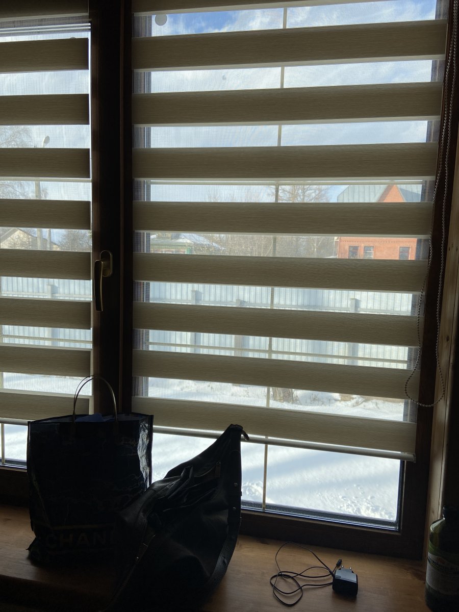 С этими шторами и так ничего не видно,они полосатые,а если их сдвинуть,получается сплошное полотно,что справа,а если совсем вверх поднять,то просто рулонные шторы.