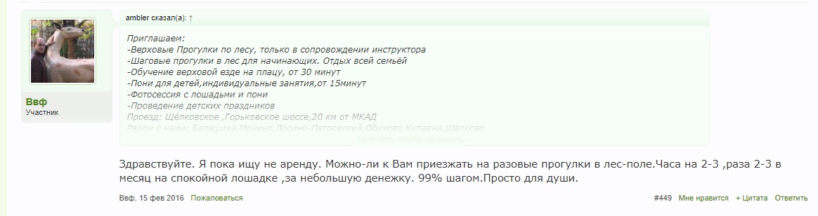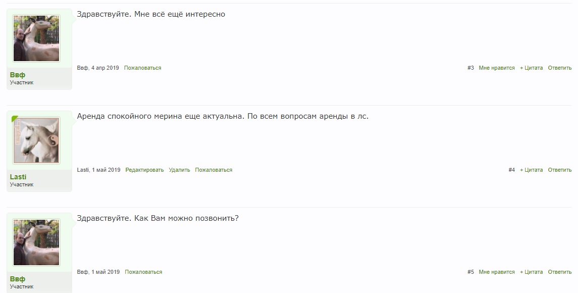 Т.к. данный человек уже несколько лет здесь на форуме ищет лошадь в аренду (это видно по истории его сообщений, в его профиле), писал мне он уже не однократно с 2016 года по аренде лошади и вот написал снова, поэтому возник данный вопрос.
