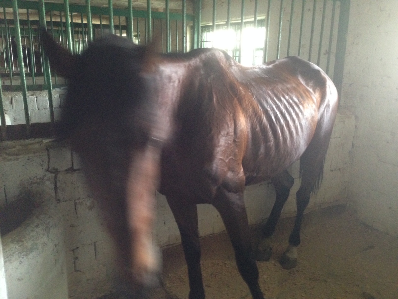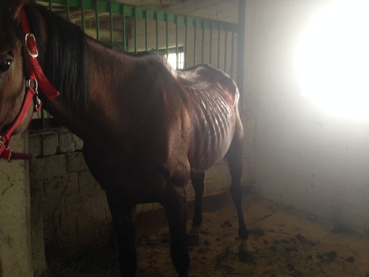 Судя по виду, с ЖКТ явно есть некоторые проблемы. Поэтому, кмк, достаточно безопасно было бы как минимум поднять сено до количества, когда будет не до конца проедать предыдущую дачу к моменту следующей. Т.е. вволю. Если сено не вот прям прекрасное, возможно, есть смысл дать лошади выбрать, что она НЕ будет есть (т.е. выкинуть оставшиеся куски сена и дать новое - если сено не лучшего качества, или например разнотравье, лошадь может не доедать плохие куски или не вкусную конкретно ей траву).