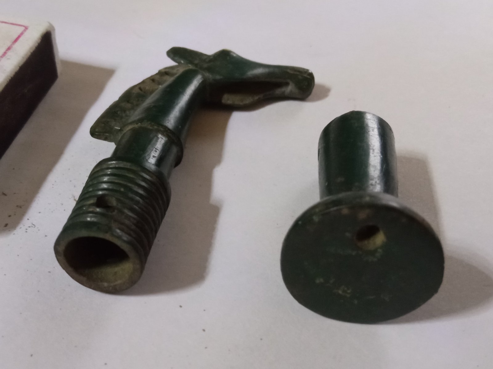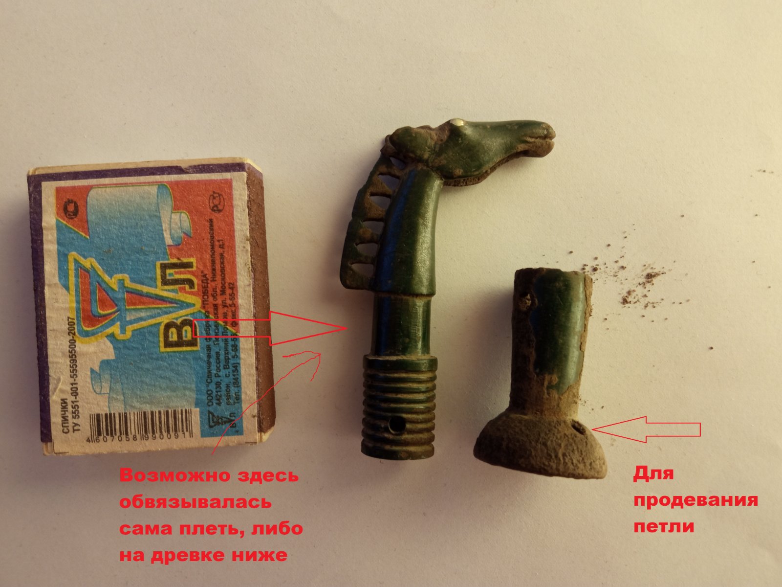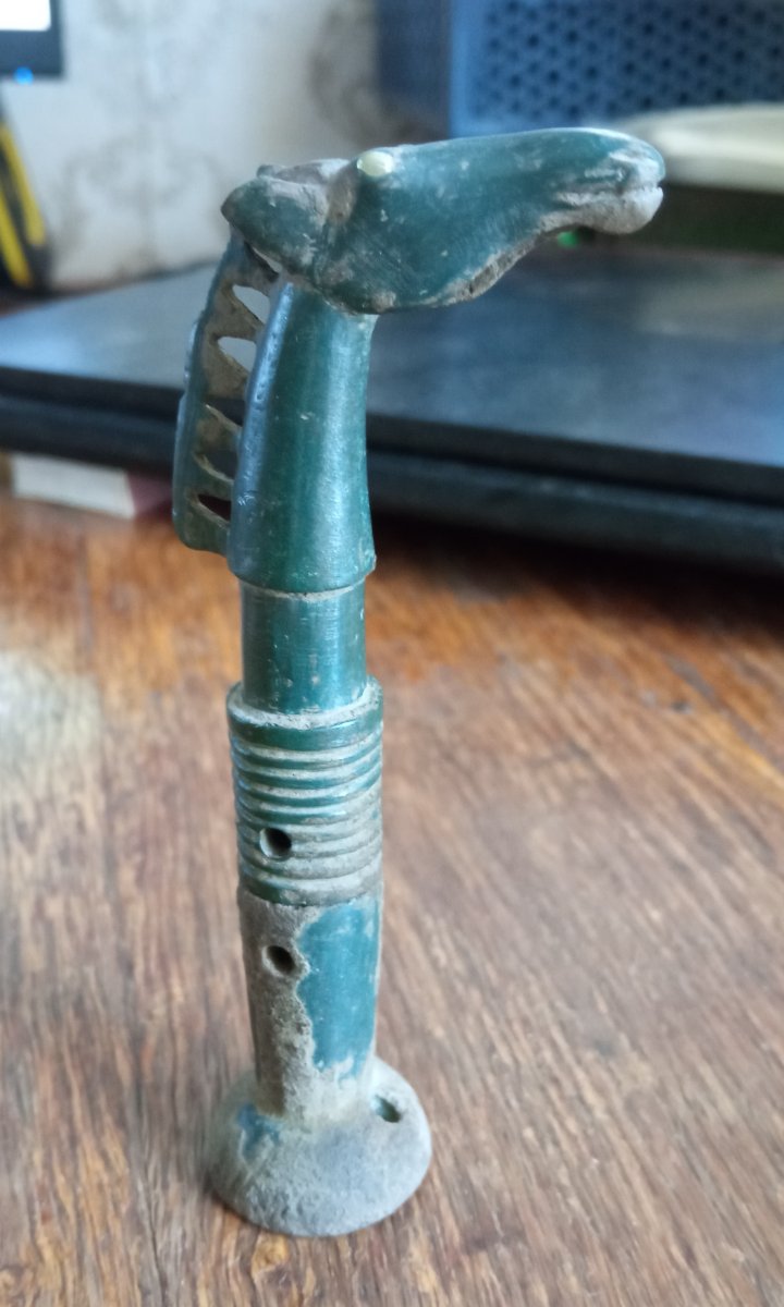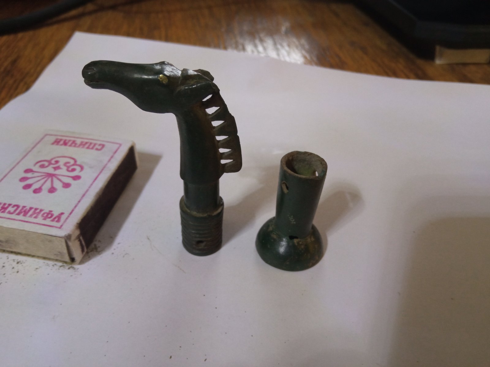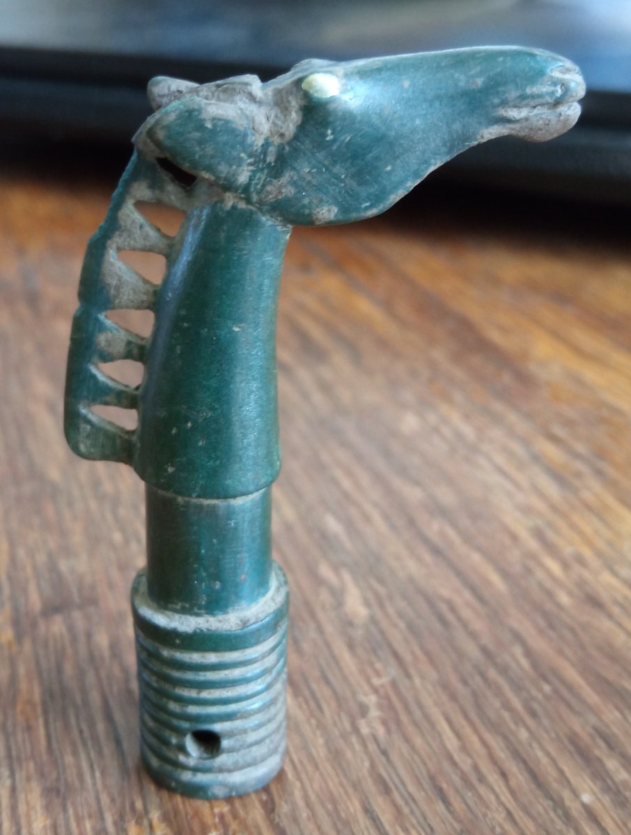 Прошу помощи сообщества в аттрибуции предмета, предположительно являющегося плетью (без деревянной рукояти). Предмет состоит из двух бронзовых частей: навершие с лошадью и округлый набалдашник.