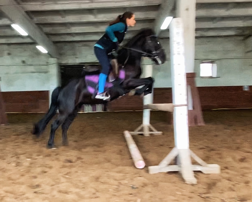 В руках и на корде катает новичков, с уверенным всадником прыгает до 80 см, гуляет в полях. Работается КМС.