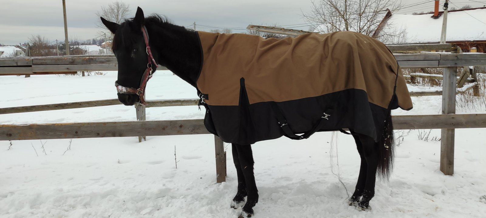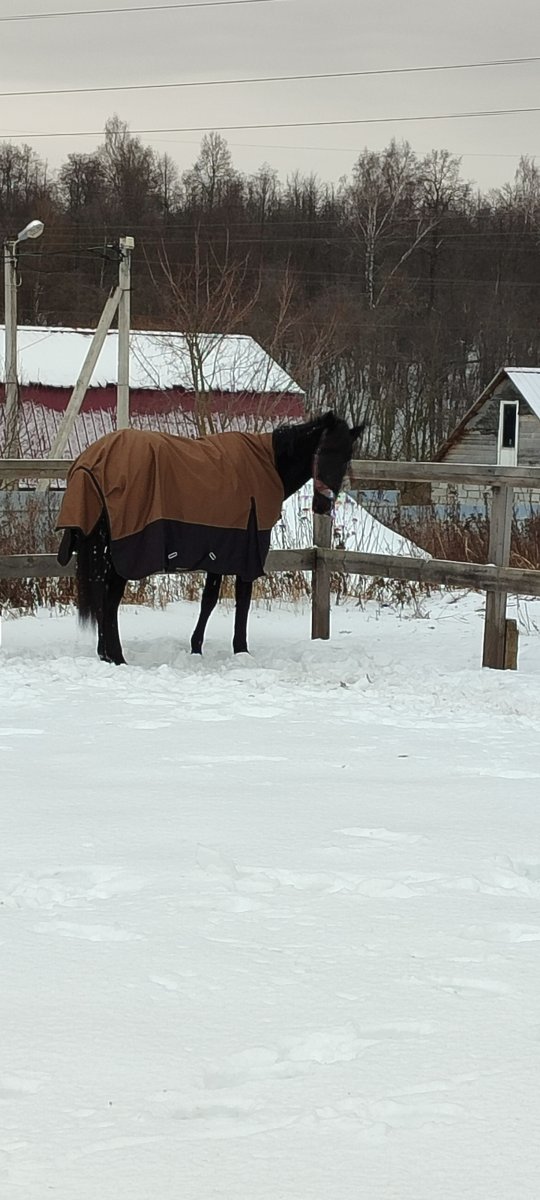 Продам попону дождевую на флисе. Высокая шея, хвостовой клапан, размер по лошади 150 см. Полностью целая. На бирке указан размер 145. На фото лошадь некрупная, с ростом 162 см.