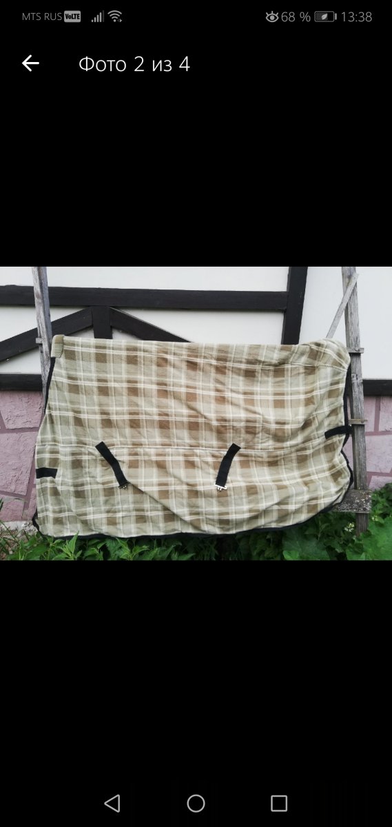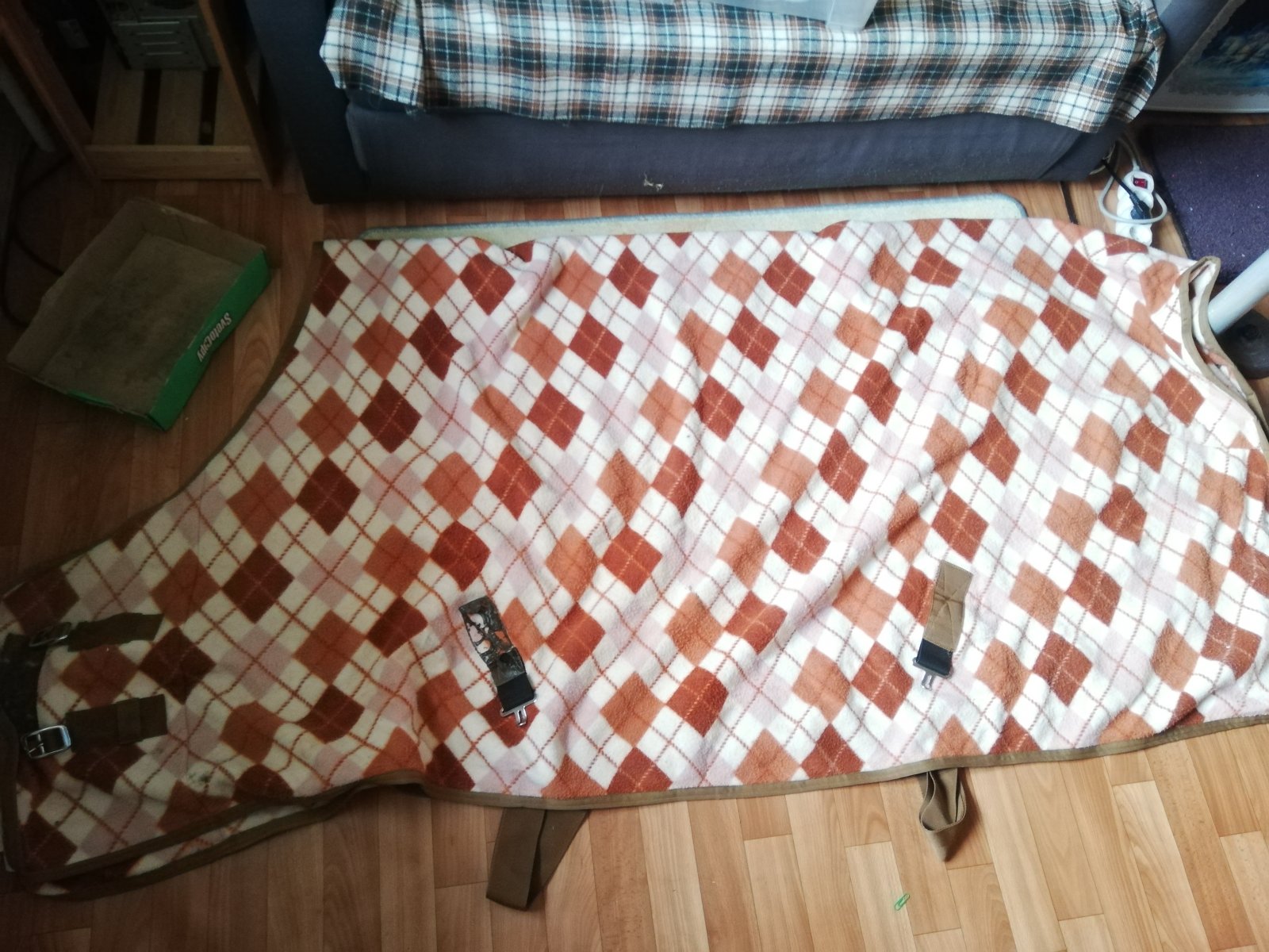 3. Попона флисовая оранжевая клетка. Привезена из Голландии. 155см. Есть недечет-подплавился крепеж фурнитуры,когда сушила на обогревателе- на функционал не влияет. 1500руб