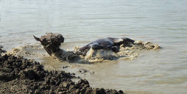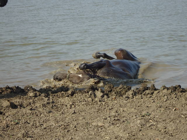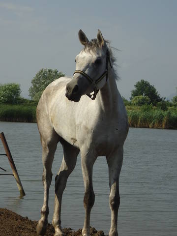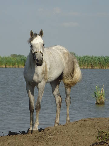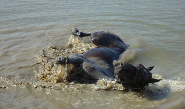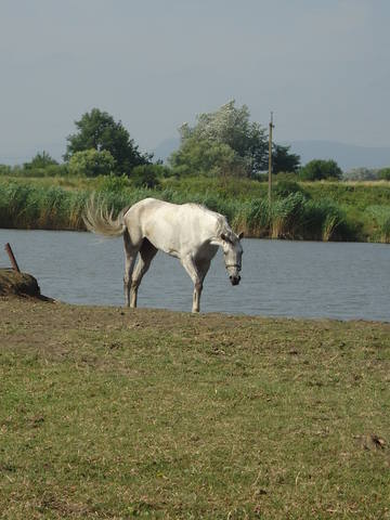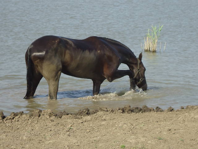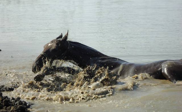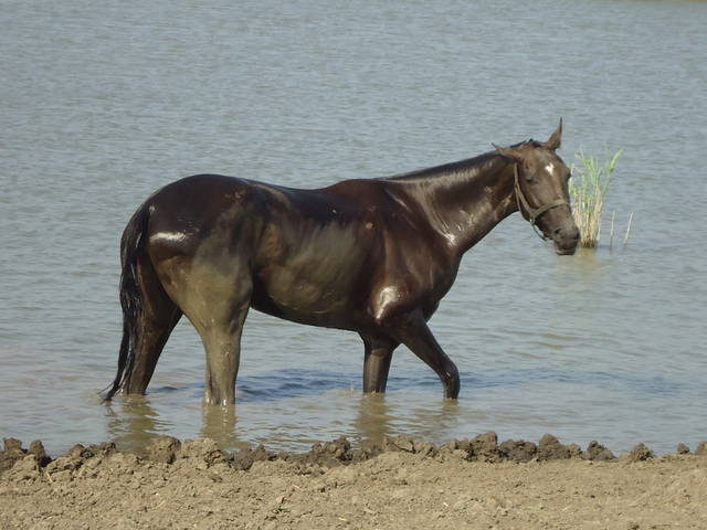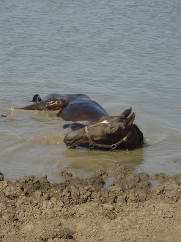 Водные Драконы, надо сказать, весьма забавные и трогательные существа, весело плещущиеся в воде у самого берега, создавая кучу брызг, наслаждаясь всеми доступными способами теплой водой, солнцем, ветерком, пением птичек, пролетающими мимо цаплями и приятной грязью. Какая же лошадь не любит грязи? Правильно, редкая. Например - Дымка. Пока подруга принимала водно-грязевые ванна, арабка стоял рядом, недоверчиво посматривая на свою подружку. В глазах читалось непонимание смешанное с завистью, но подойти хотя бы к кромки воды арабушка категорически не решалась. И когда тянулась попить водички - превращалась в жирафа с километровой шеей. Но боже упаси, что бы сделать шаг к воде!! Нет!!