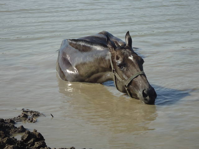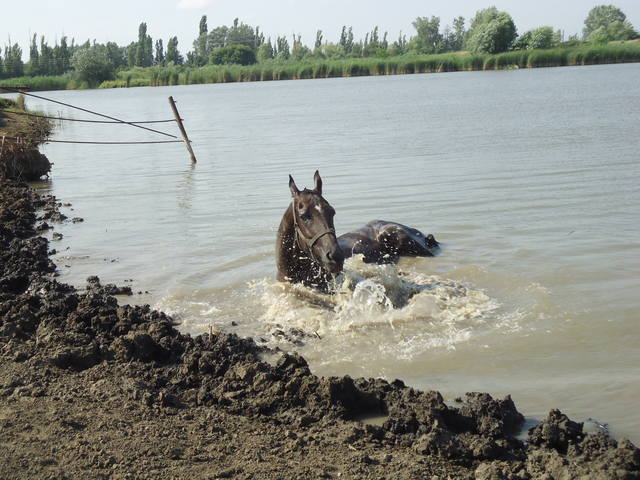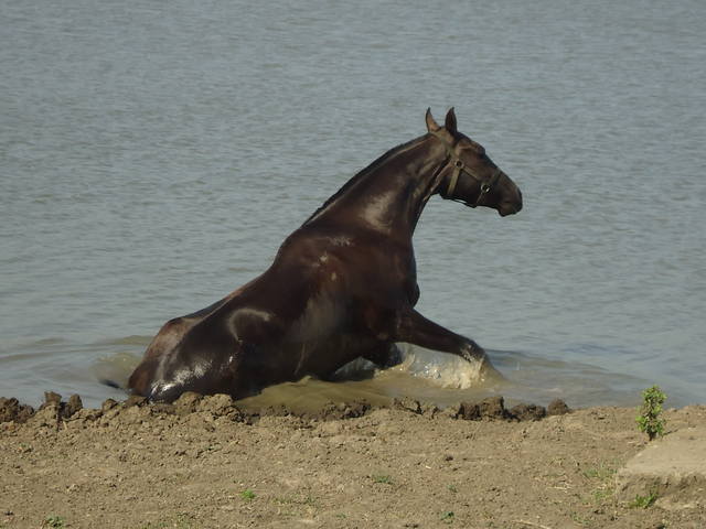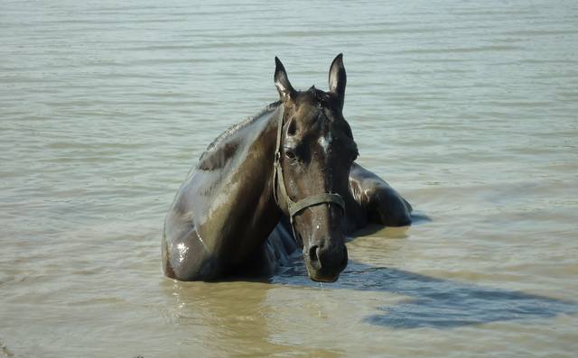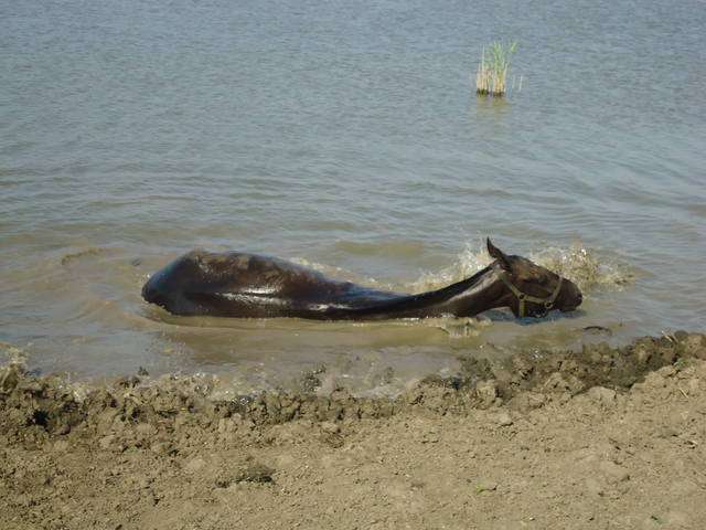 А Апарелька тем временем плескалась, словно ребенок, который дорвался до бассейна!! Она хрюкала, вздыхала, кряхтела, охала, ахала, ворчала, гугукала,что-то балакала на своем конячьем языке.. Я вообще не подозревала, что лошади умеют издавать СТОЛЬКО звуков во время купания. И нырять всей мордой под воду. И при этом проделывать все с таким блаженным видом, что больше всего на свете хотелось на тот момент растянуться рядом, в теплом-теплой водичке и тоже постанывать-поохивать от удовольствия :)))