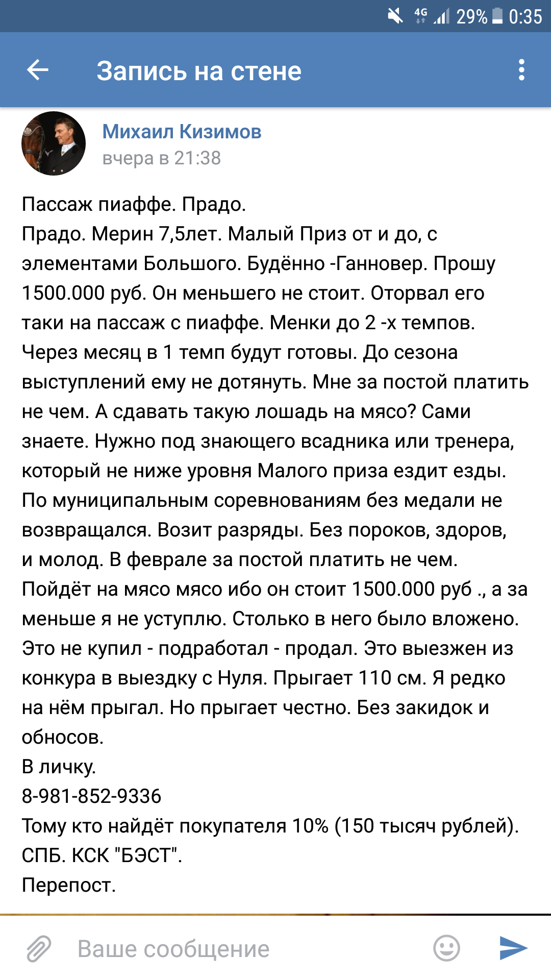 Да кто ж на мясо то рубёнка сдаст?. Многие серьёзно восприняли. 90% людей - Шариковы.Вы что серьезно так думаете??? На мой тренерский взгляд эту лошадку надо еще многому обучать, расслабить. Тем более это Россия, тут другие взгляды.Для такого ценника нужны очень хорошие, положительные баллы) и старты, не только местные. Где то читала, что эту лошадь хотели на мясо сдать, если ее не купят за 1,5 миллиона...прям печально даже...
