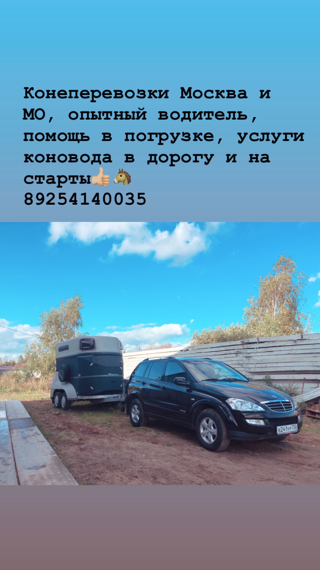 Водитель коневоза опытный и аккуратный человек, возим на прицепе Бокман Мастер, оснащён профессиональной камерой, кормушкой и амуничником.