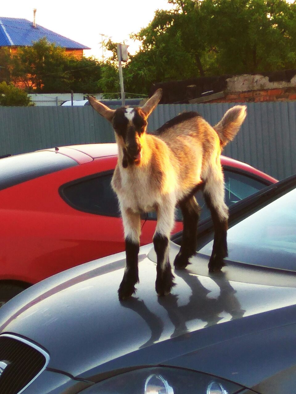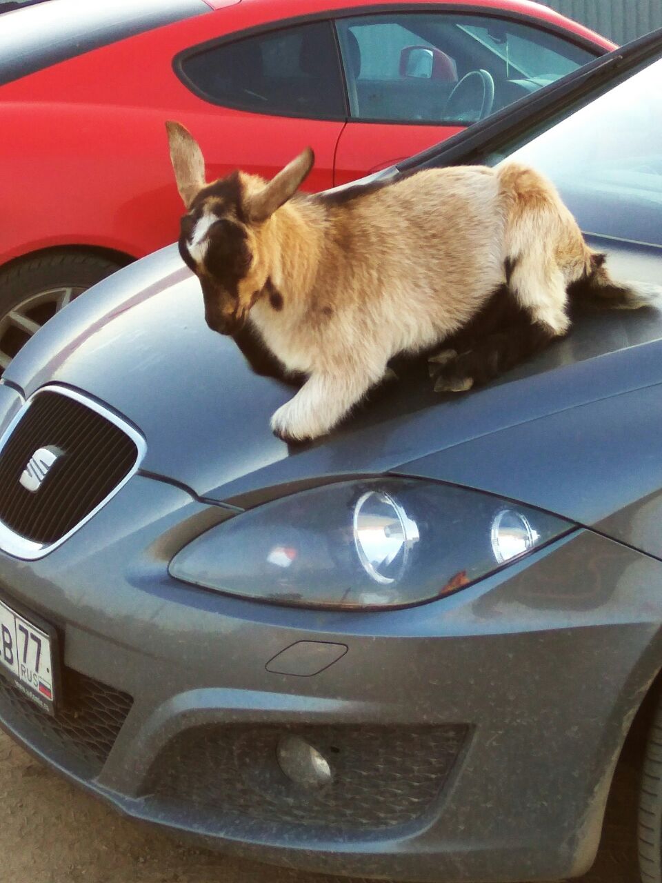Это наглое животное отдыхало на капоте моего Бонифация, а потом не знало как культурно сползти, потому ехало с капота на заднице. Ему блин показалось что это весело :)