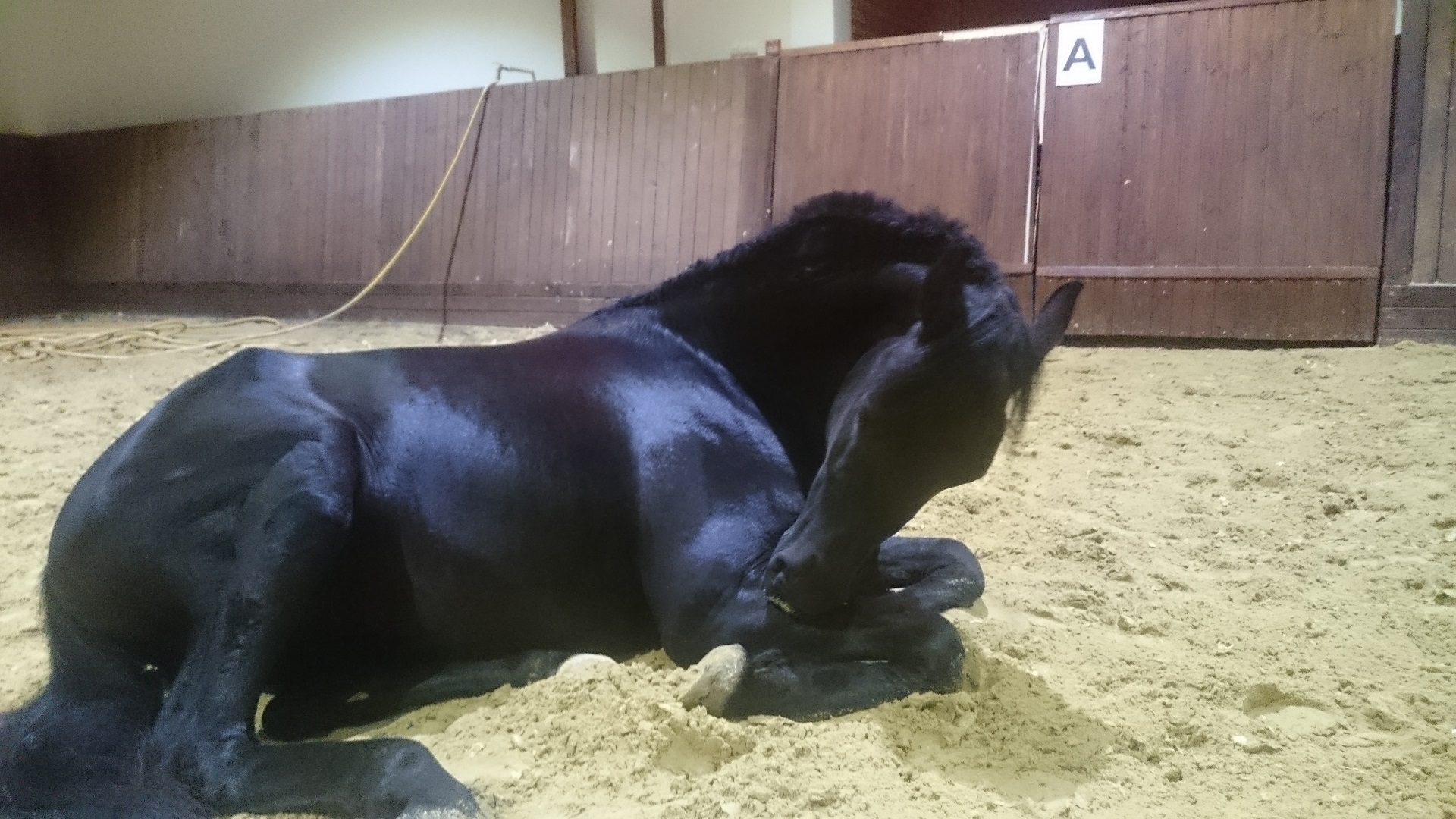 Эта наглая чорная рожа умеет засекать время. Вечером по плану шагаем час и идем из манежа на развязки делать всякие процедуры. Он шагает 40 минут и начинает планировать мероприятия по отвлечению меня от нудного и монотонного шагания. Самый действенный метод, изобретенный хитрожопым Орфеем такой: свалить от меня к выходу и начинать копать яму передними ногами. Роет нору такую в глубину, нюхает, фыркает и гребет копытами песок как 500-килограммовая собака... Я несусь тут же его прогонять, он отходит на пару шагов и внимательно на меня смотрит. Я начинаю ногой закапывать яму. Как только я делаю первое "копающее" движение, лошадь сразу с великим облегчением и пониманием в ясном взоре тут же расценивает это как команду "лежать" и плюхается у ног моих ))) Следующие 20 минут оно лежит :)))))))) Иногда еще успевает поваляться и выклянчить вкусняшку-другую. Рожа при этом нахальная, но честная-честная))) Через 20 минут их величество изволят вставать и направляться на выход )))) Он меня на этот трюк ловил уже раза три точно, знает же хитрюга, что я, даже пока просто шагаем, все ямки ногой стараюсь закапывать и ровнять, все, какие вижу, и чаще всего делаю это неосознанно )))