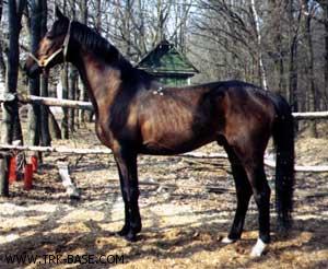 Отец Приз-2 гнедой жеребец 1985г.р.в Опытном (Рязанском) к/з Тракененской породы (трк.V 175)