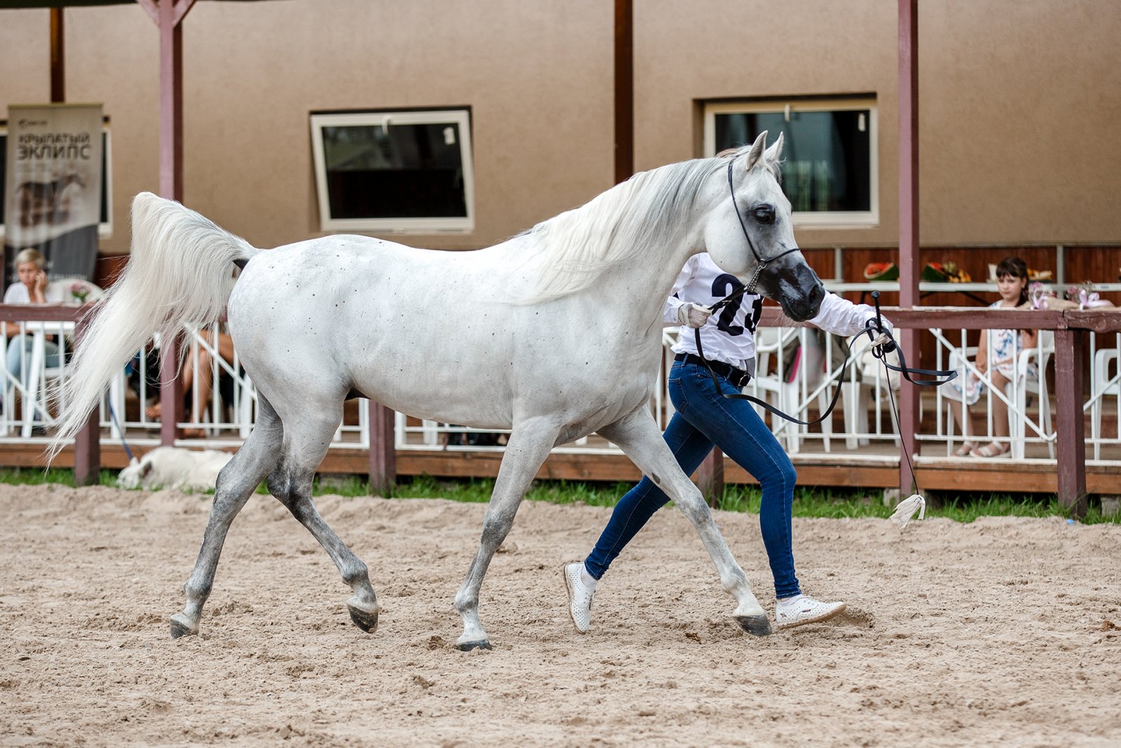 Мария Андреева и серая арабская кобыла Приза, 2012 (Курьер х Подача), з. Хреновской к/з, вл. Калгановский конный завод