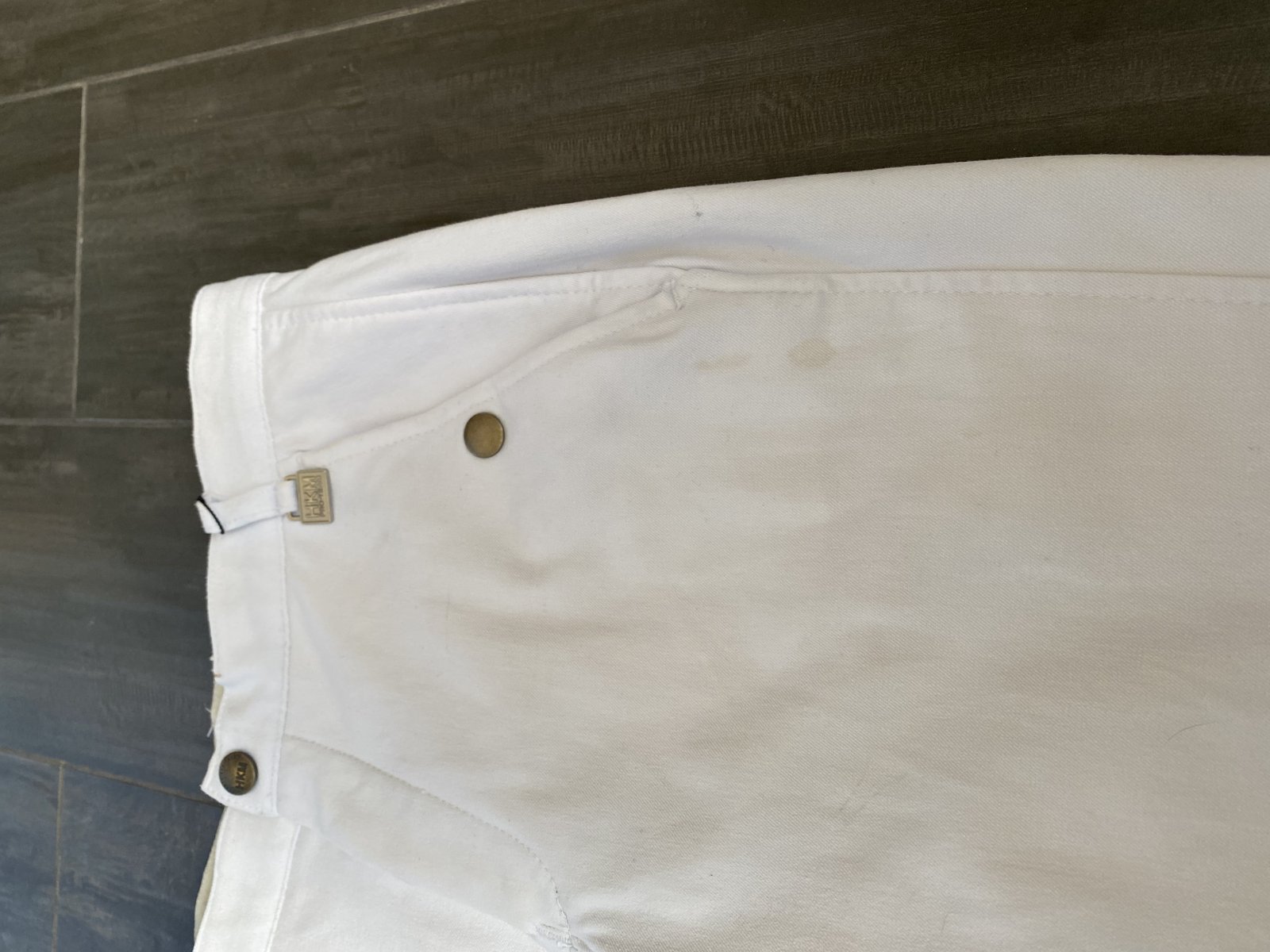 Надевались 1 раз, из дефектов - небольшое пятнышко у кармана (фото прилагается - 6), и следы сзади от седла (фото прилагается - 2).
