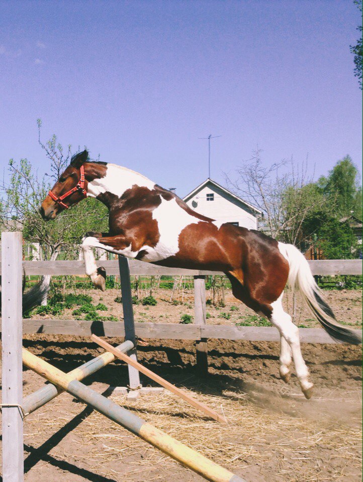 Сейчас в работе с галопом и небольшими прыжками до 80 см под верхом, на свободе прыгает больше