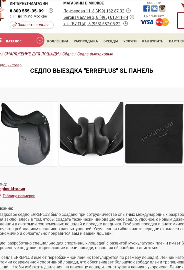 Продам выездковое седло erreplus с sl-панелью в отличном состоянии. Седлу 2 года. покупалось новым, ходило на одной лошади под одним всадником. На данный момент раздвинуто по лошади на 34. Ленчик можно двигать от 32 до 34 размера. Можно и до 35, но при условии очень низкой холки. Канал тоже можно изменить, как уменьшить, так и увеличить. Подушки можно перенабить не вскрывая седло, осуществляет подгонку магазин кони-пони. Стоимость : 165 000р.