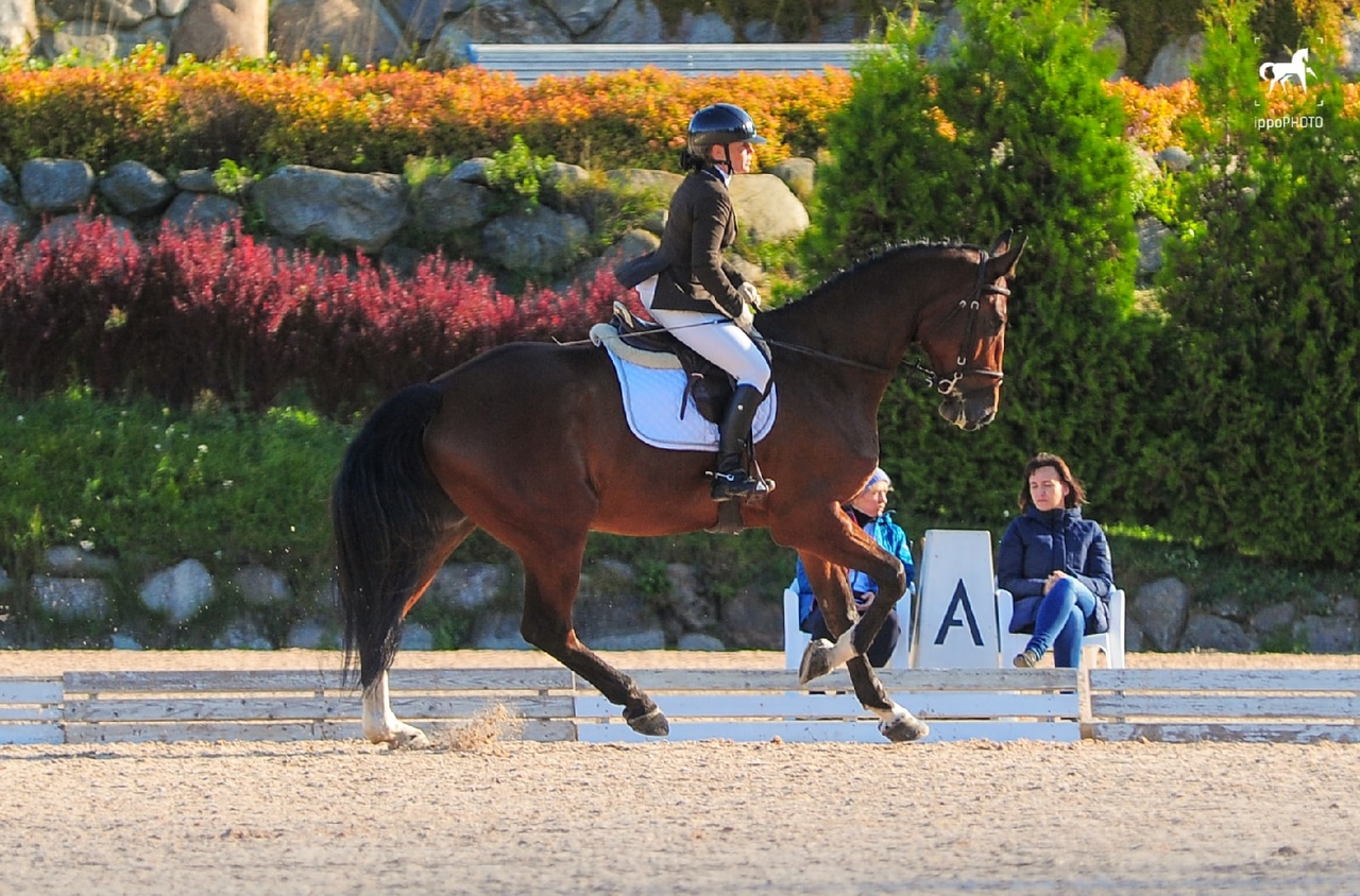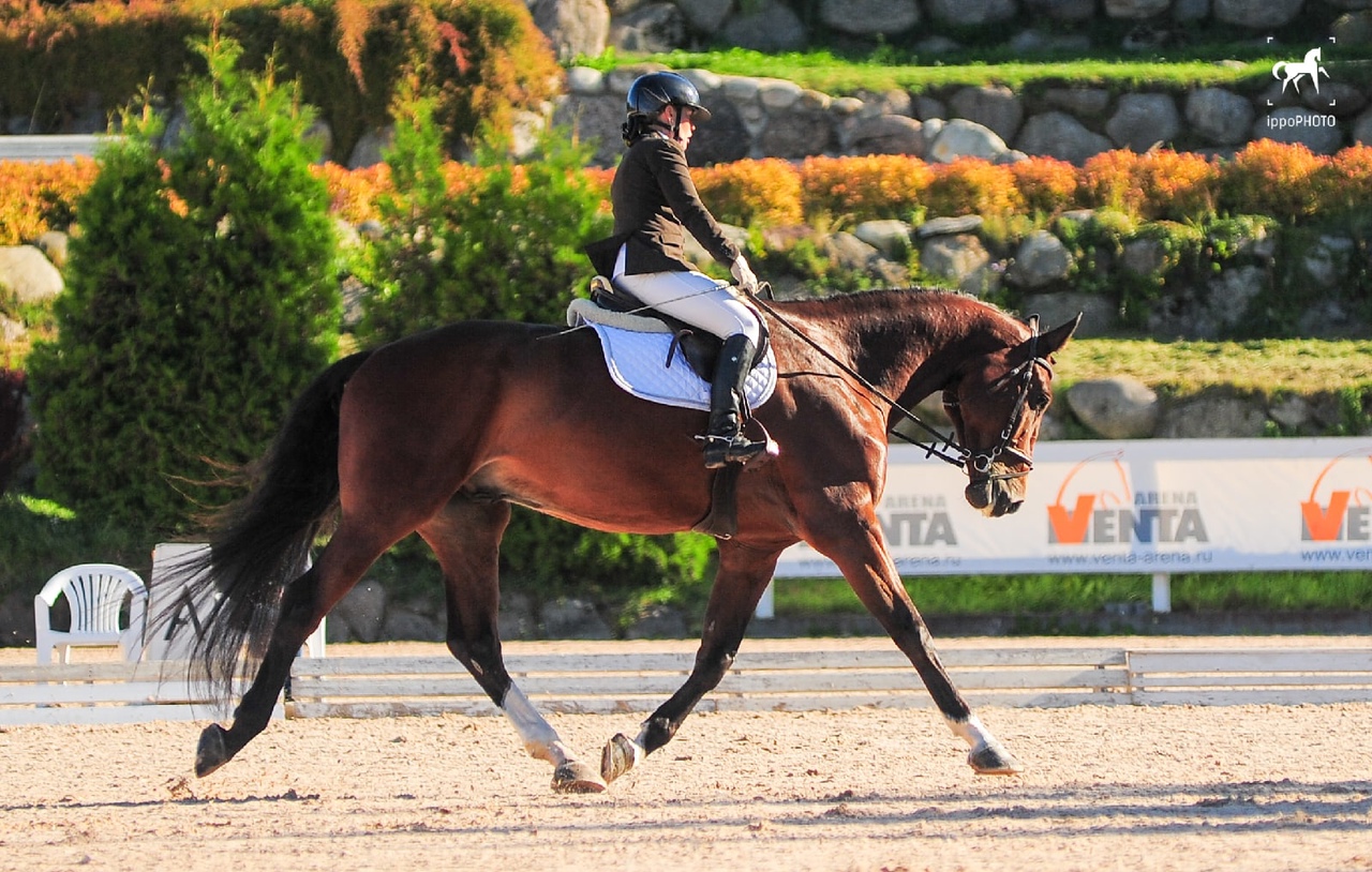 Чемпион СПб по 4-х леткам по выездки. В 3 и в 4 года бегал езды, всегда в призах или первый. Езды для 4-х леток 76%