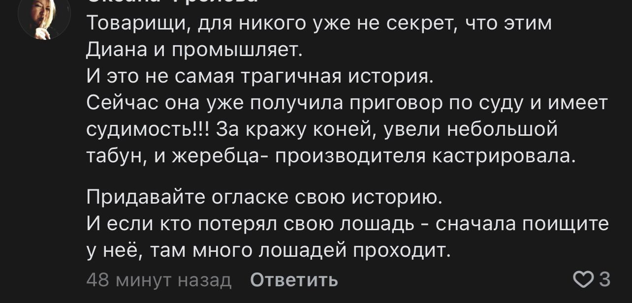 Добрый день. Столкнулась с такой интересной историей. Хочу поведать историю которая произошла со мной. И пусть моя история поможет кому то. Как говорится учитесь на чужих ошибках. Вообщем приобретала я тут коня у знакомой. Мне ее рекомендовали, как хорошего тренера, как знающего лошадей человека. Вообщем человек был моим доверенным лицом в выборе коня. В данной роли у меня выступала Алимова Светлана. https://vk.com/svetlana.angela Она мне предложила шикарного коня, которого та купила/обменяла (версии были разные) у Доброжецкой Дианы(Истра, парфос) https://vk.com/dobrooka вообщем коня я купила у Светланы, но ДКП я подписывала с Гиржовым Николаем, не могу сказать кем они друг другу приходятся. (Не смутило меня это так как муж/жена какая разница, людей мне советовали очень) до покупки связывалась с Дианой, для проверки, все по коню тоже подтвердила. Вообщем, мне привезли коня, он был худоват, как утверждала Светлана и Николай, документы в коневозы остались. Да, так как это доверенные лицо поверила. Подписали мы ДКП. Справку пообещали на следующий день. Собственно тут и началось. Справку ждала 2 недели и мне справку по итогу скинула Диана, но вот парадокс, справка из Мордовии. Ну и естественно не от того клуба откуда он выехал. Ну и паспорт разумеется мне не отдали. Вообщем я начала выяснять, может конь краденый или еще что. И собственно нашлась хозяйка в Белгороде, которая как оказалось отдала коня доживать на пенсию, ему оказалось 24 года, а мне сказали 14. Она не имела права его продавать, отдавать, в договоре было прописанно, что может нести легкие нагрузки, Бедолага еще пол года бегал парфос по пересеченке 5-6 часов. Хозяйка отдала его так как у него был брок. Чтобы тот погулял. Вообщем, Диана переобувалась много раз, деньги разумеется возвращать не хотелось. Но придумывалось много интересных версий. Но по итогу, заявление, статья. Человек мало того что продал не свое животное, ей он отдавался на время по договору ответственного содержания. Так еще и кличку переделала с Эбрнита на Града. Еще и гоняла на нем по 5-6 часов. Чипировала на новую кличку, подделала справку. Продала. Сменила год рождения. Вообщем великолепно! И после еще пытается обвинить меня и всех окружающих ! https://vk.com/parforce Я много раз предлагала решить конфликт мирным путем, вернуть все на свои места! Но деньги рубят. Кому захочется терять 500 тысяч. Лучше пару лет отсидеться походу!