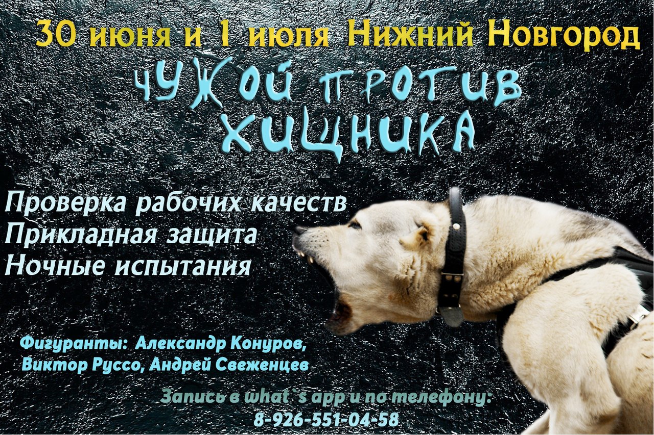 Владельцы «серьезных» собак могут протестировать охранные качества своих любимцев с одними из лучших фигурантов России, которые специализируются на прикладной защите. Два дня Александр Конуров,Виктор Руссо и Андрей Свеженцев будут ждать всех желающих с их собаками для тестирования и постановки на охрану хозяина, автомобиля и других ресурсов.