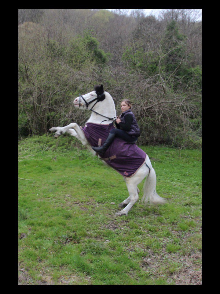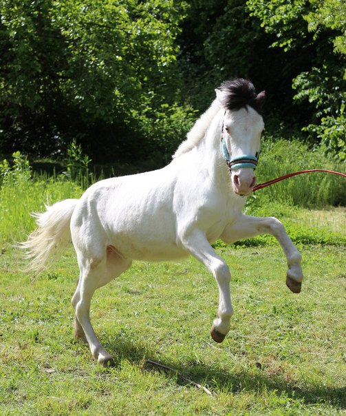 Дрессированный. ложится, садится, встает на свечку,кланяется и т.д.