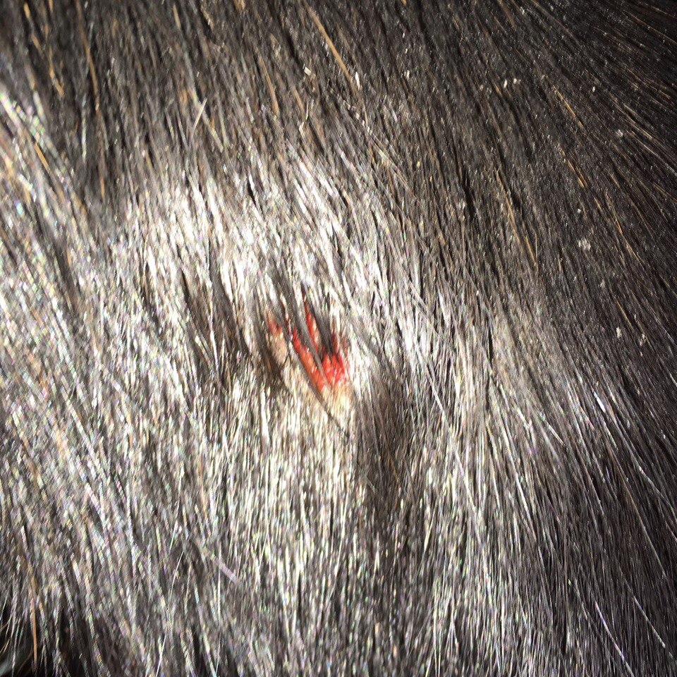 Нет фото самая большая и свежая возле щеки в районе ремня недоуздка. Эта н а шее. Три дня назад - ничего не было!