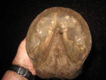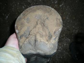 Мне она кажется недостаточно сильной, эластичной и выглядит "лохматой". Она явно недоиспользована. Виновата ли в этом редкая/неправильная расчистка, ходьба с зацепа? Или он ходит с зацепа из-за проблем со стрелкой и ему больно наступать на пятку?? Похоже это на гниющую стрелку? Никто мне на проблемы со стрелкой не указывал, в тч и коваль. Но при нажатие на одну из стрело задней ноги - он явно дал понять, что ему больно.
