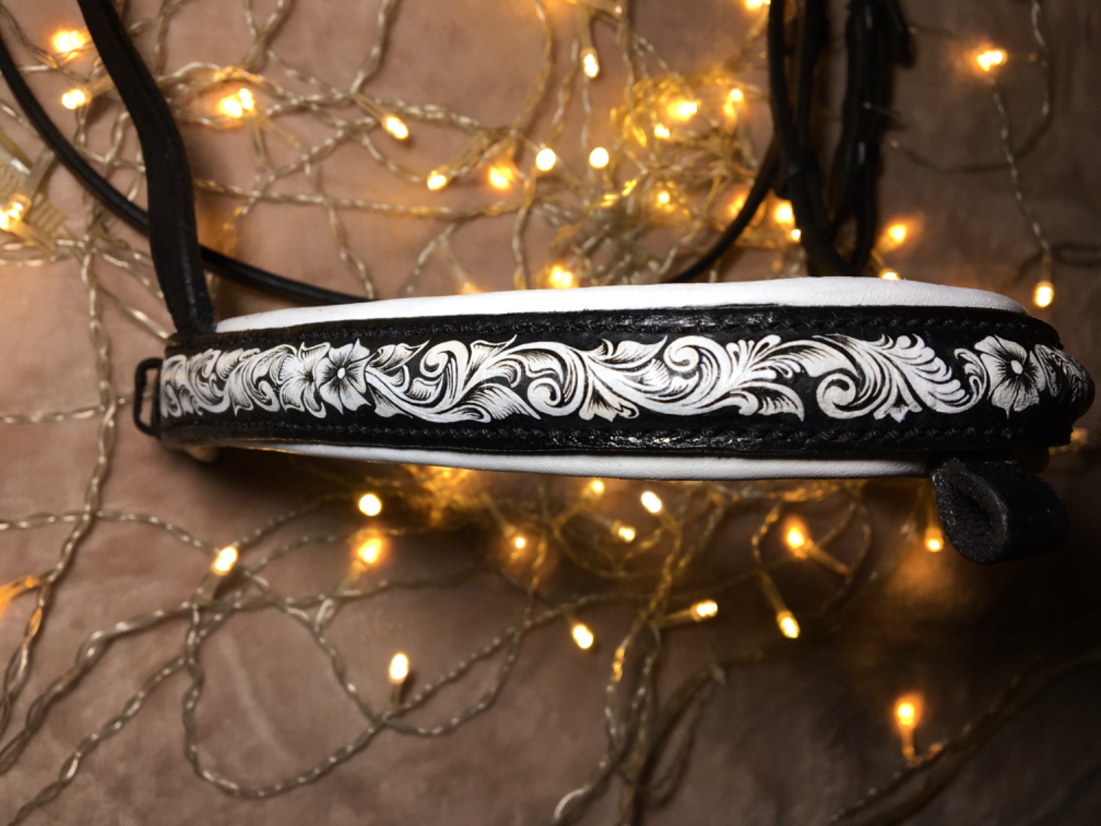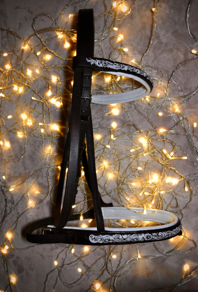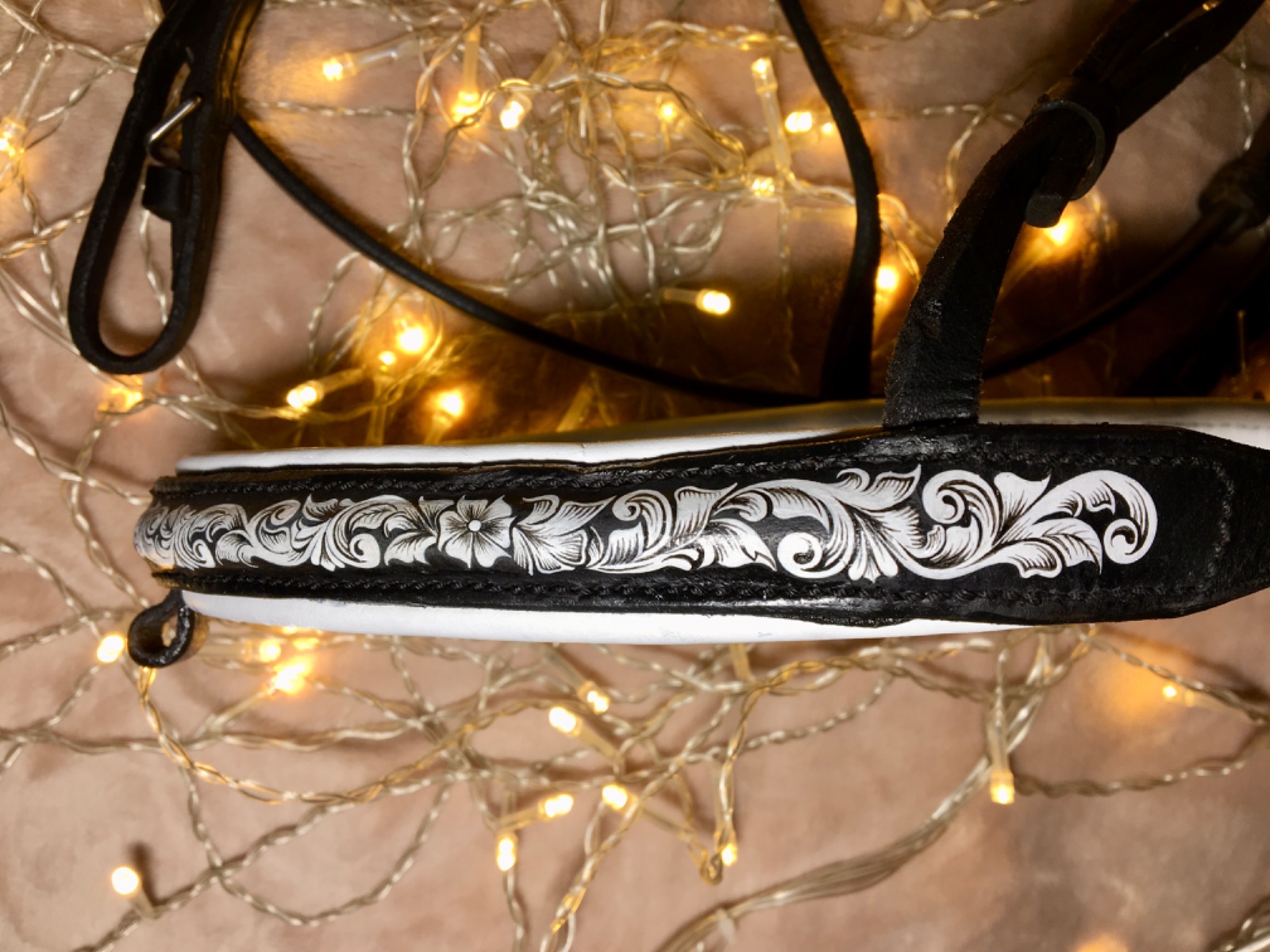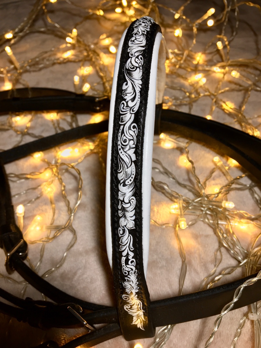 Продам трензельное оголовье с белыми подложками и барочным узором, ручная работа, 15000. Подойдёт для фотосессий, выводок, соревнований, а также для ежедневной работы, специальная краска устойчива к осадкам и погодным изменениям, особого ухода не требуется. Регулируется от фулл до х-фулл, орнамент можно дополнить или видоизменить по вашему желанию, расписать любую вещь в комплект: повод, нагрудник, перчатки и т.д. Принимаю индивидуальные заказы, работаю как с новыми вещами, так и с б/у (без предоплаты), разрабатываю рисунок с учётом всех возможных пожеланий, в любых стилях и любой сложности, вплоть до репродукций известных картин прямо на налобном ремне