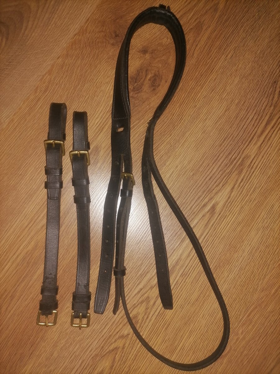 8. Нащечные ремни и затылочный коб с золотистой фурнитурой. На запчасти. Один нащечный был зашит. На затылочном есть трещинки на ремешках по бокам. 500 руб.