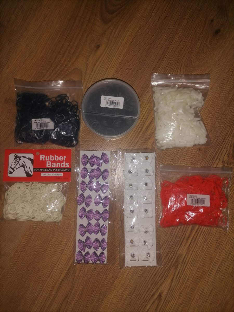 11. Новые наборы резиночек по 500 шт чёрные, синие, красные, белые. По 100 руб за набор. Наборы бантиков новые по 16 шт сиреневые и белые - по 200 руб за набор.