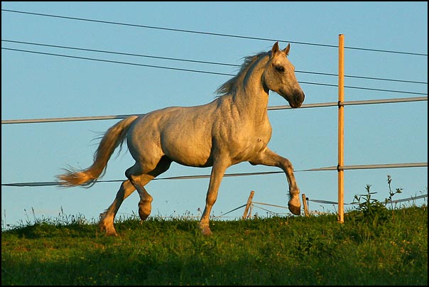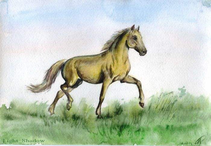 Нарисовала седня. Правда, фотик и сканер исказили цвета и получилась лажа(((Конь-то белый на самом деле, ну просто освещен солнцем...