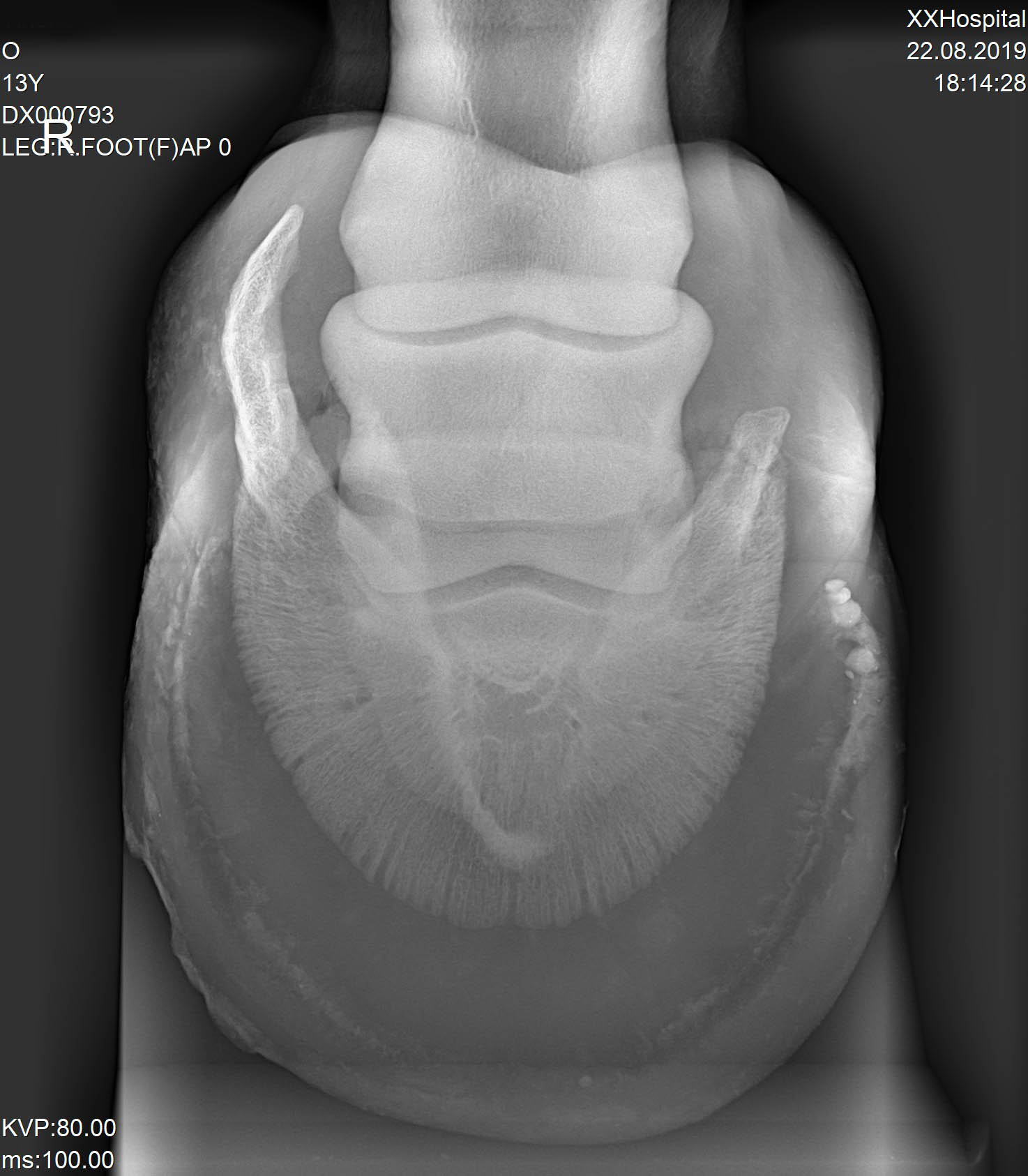 Правая грудная конечность – оссификация латерального хряща копытной кости.