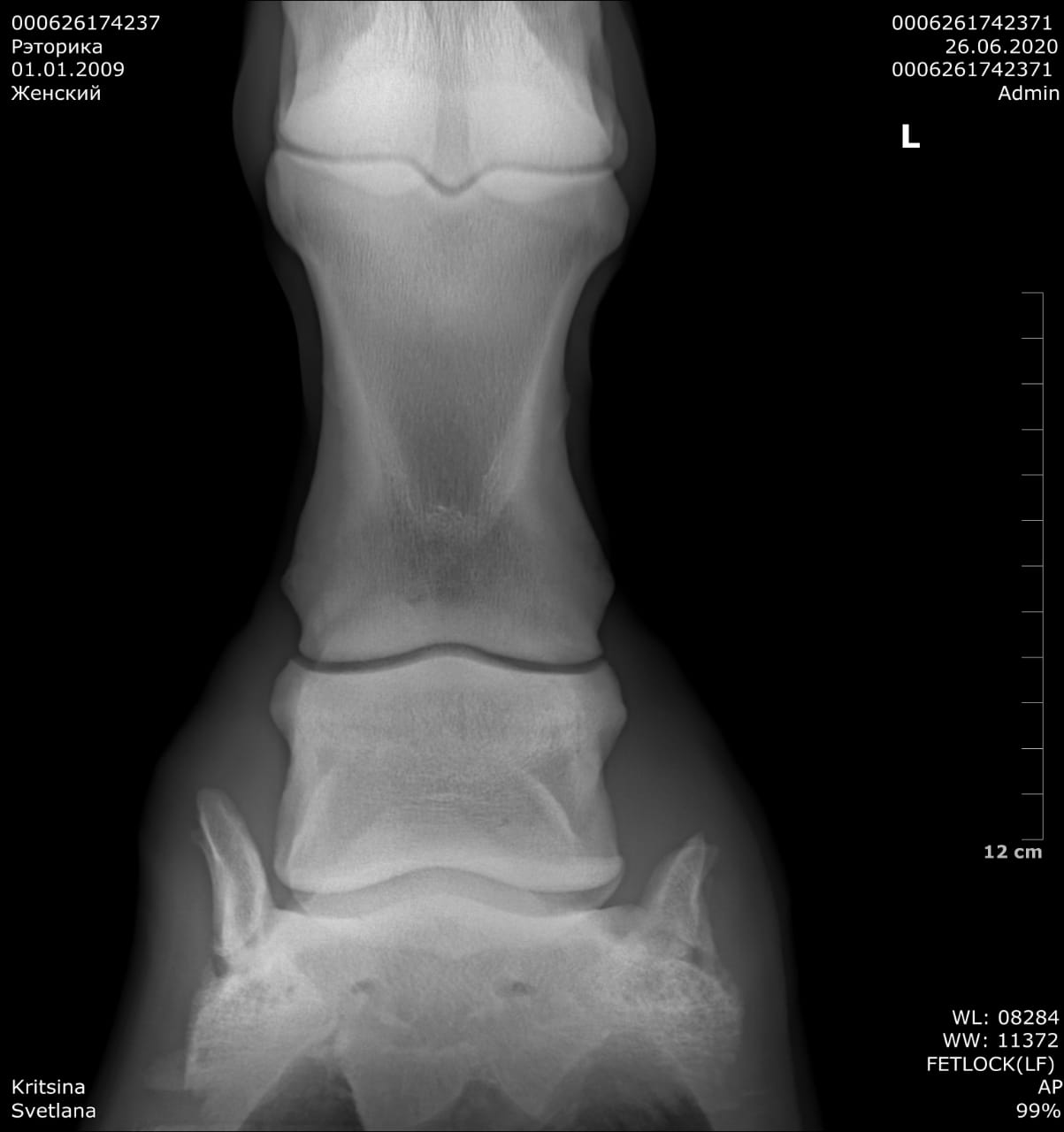 Левая грудная конечность – оссификация латерального хряща копытной кости.
