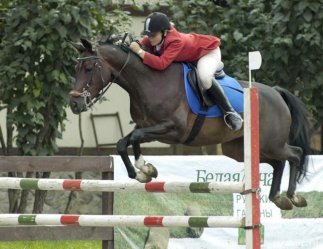 Куплена она полтора года назад в Кировском к\з. где родилась, прошла заездку и прыжковой "Экспресс-тренинг"....в 4 года она там "встала" и ее продали как "не перспективную" частному владельцу "по полям кататься". Новый владелец предложил мне "попробовать попрыгать".Очень осторожно и не спеша я начала с ней работать. В мае 2008 ее привезли а в июне на отдыхе на природе я топором себе пополам рубанула ногу... и на 2 летних месяца была замурована в гипс... эх... пропустила весь летний сезон. Может и к лучшему. Кобыла отдохнула, успокоилась... На время больничного я отдала ее в работу девочке-спортсменке. Без прыжков. Напрыгивали на свободе. Села я на нее только в сентябре, да и то не могла полноценно работать - нога долго восстанавливалась. Я не понимаю, как можно было на ней прыгать! Она до того была не выезжена, не уравновешена, по прямой не могла вообще двигаться, спотыкалась и падала на ровном месте. Но шло время, я работала с ней и с мая 2009 начала выступать в конкурах для молодых лошадей. Главной целью у нас была не победа а работа над доверием всаднику, повиновение и расчет (прыгала она после приезда Бог весть знает откуда - как получится, так и толкалась, нервничала, а если жердь тронет, неслась сломя голову). Весь летний сезон 2009 мы с ней попадали в десятку лучших и лишь несколько раз входили в тройку призеров.