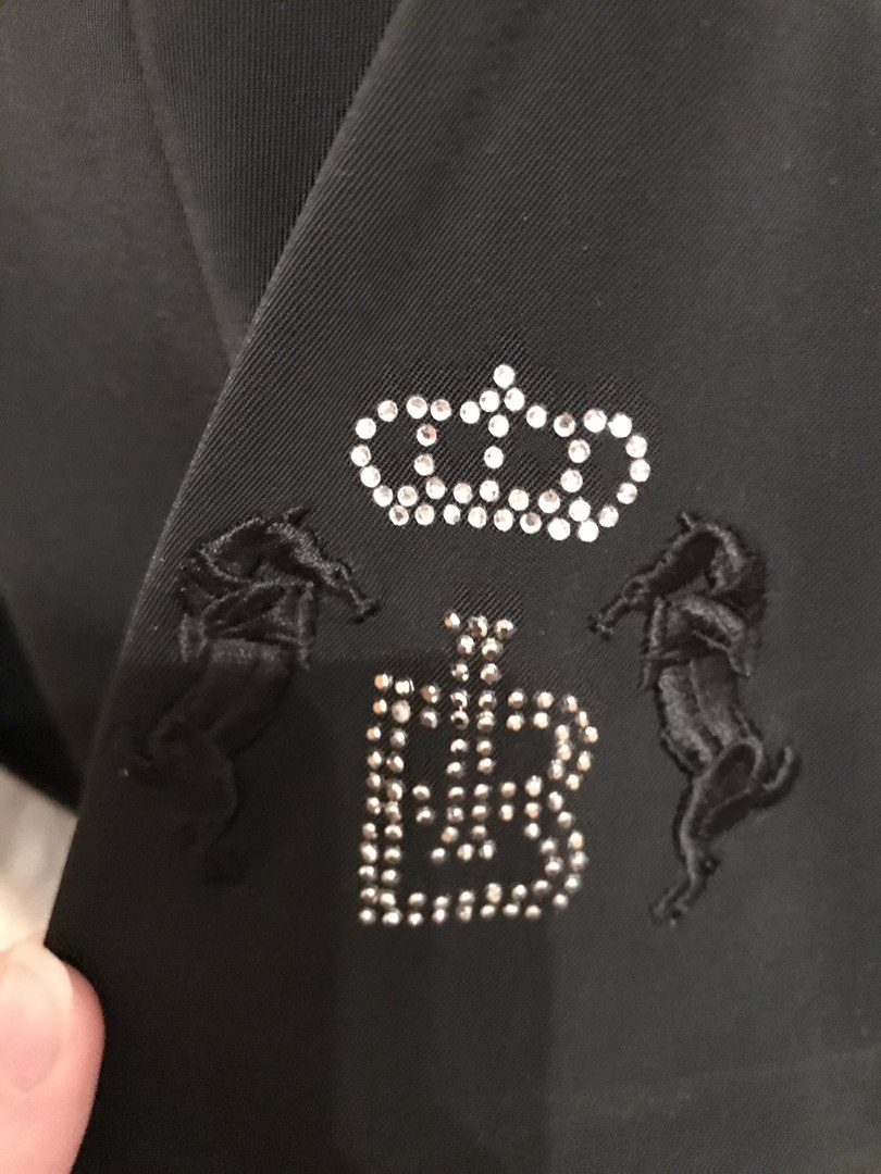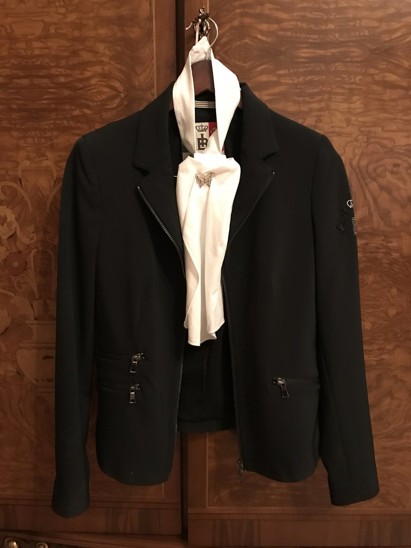2. 46 русский размер, серый. Не облегает, ткань не тянется. Необходимо немного подшить подклад, немного потерт воротник. Состояние хорошее. - 1000 р. (прилагается фото на лошади)