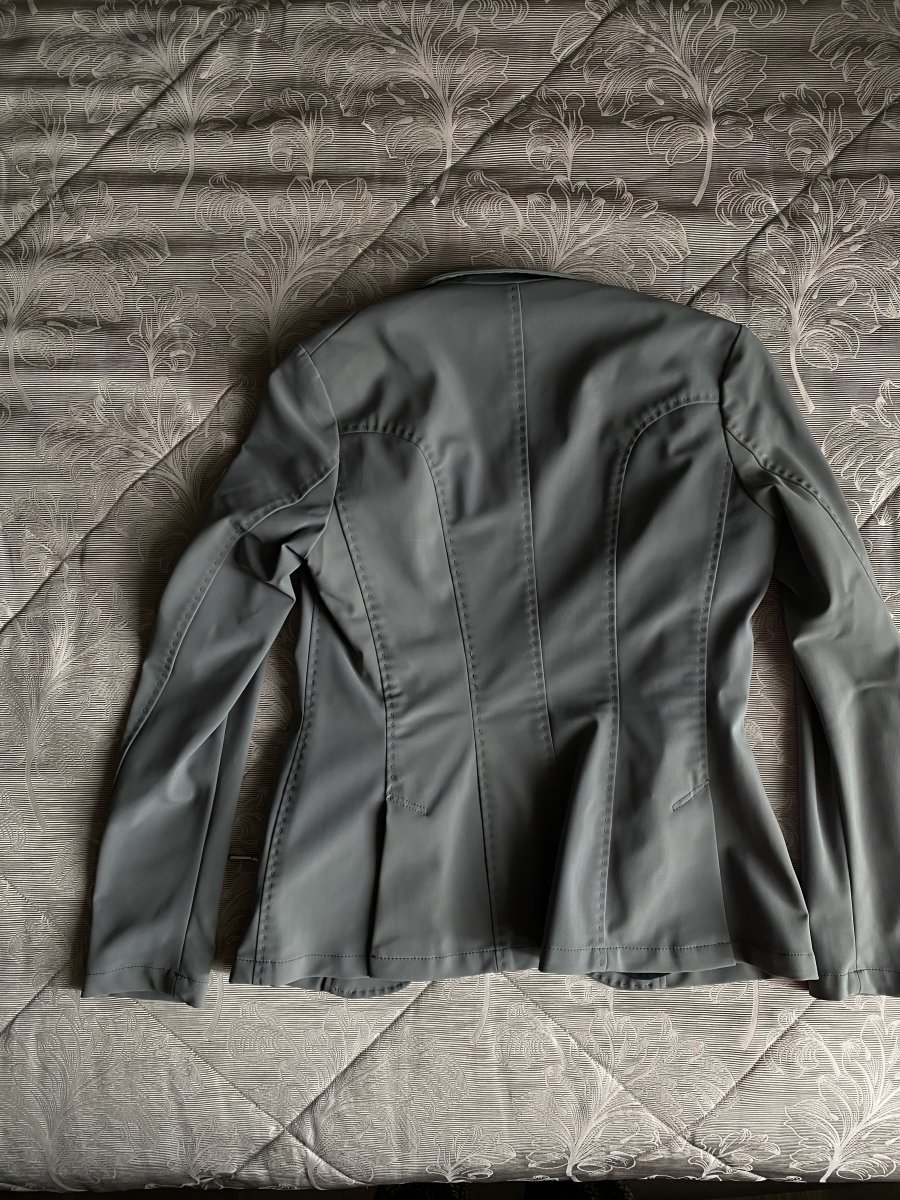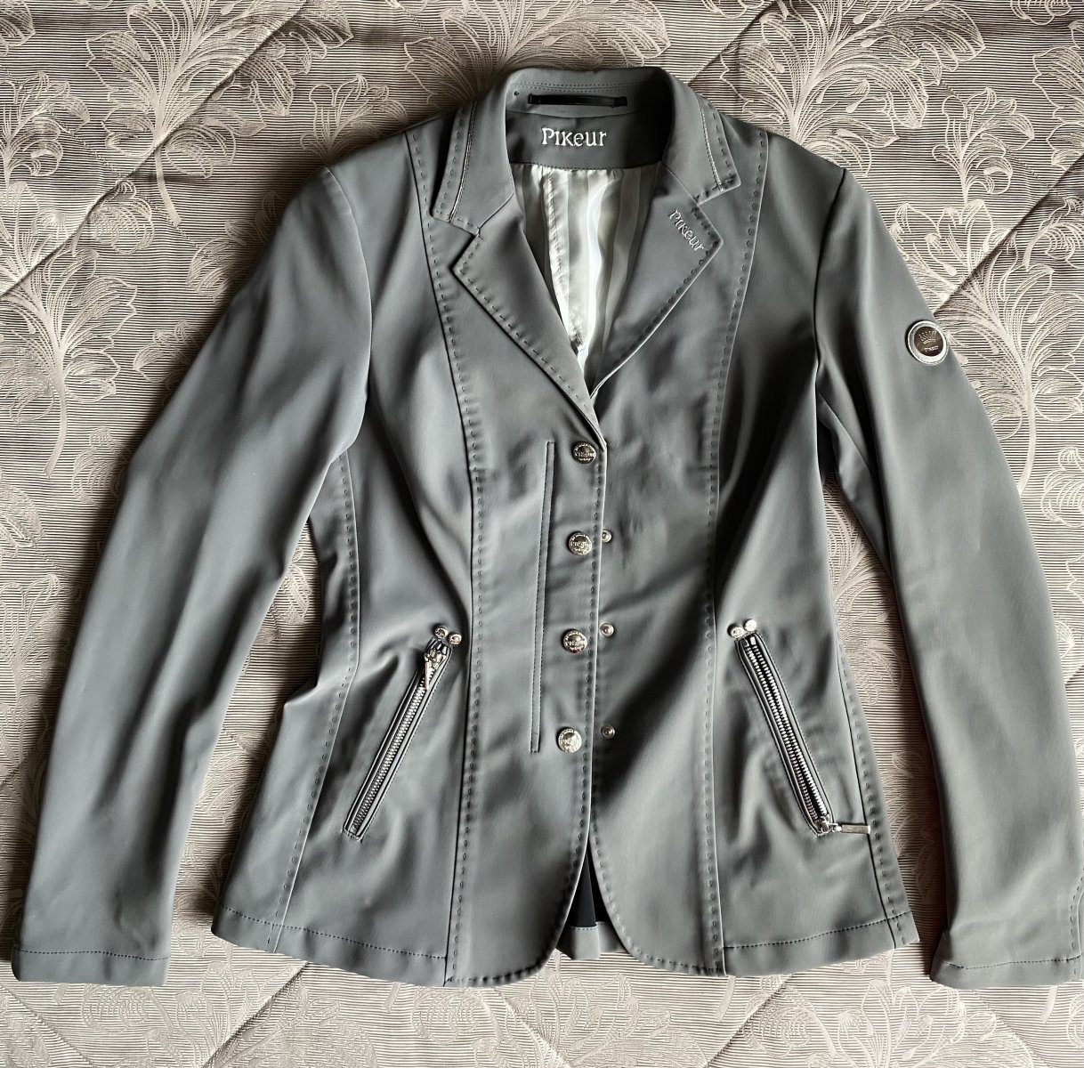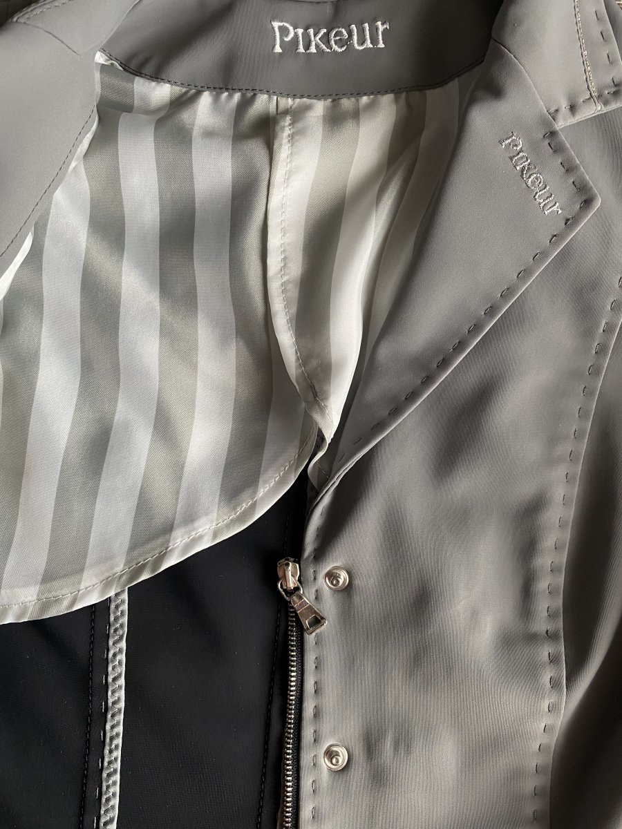 Эффектный редингот, с утонченной отделкой. Классический редингот из функциональной ткани Softshell, ткани, которая очень проста в уходе, не мнется и быстро сохнет. Элегантный приталенный крой, скрытая молния с планкой на пуговицах для оптимального комфорта. Два кармана на молнии. Фирменный логотип Pikeur на рукаве. Размер 38