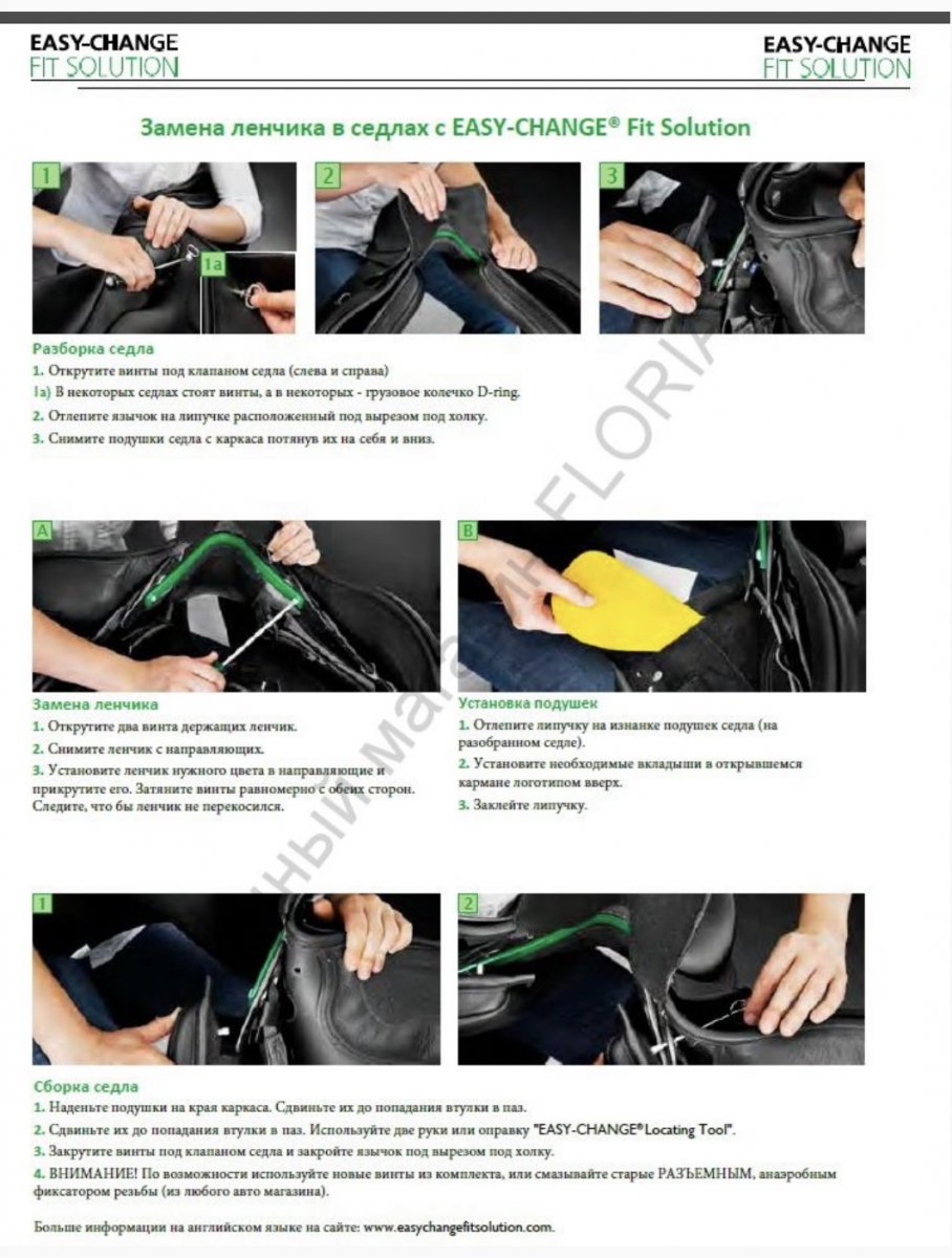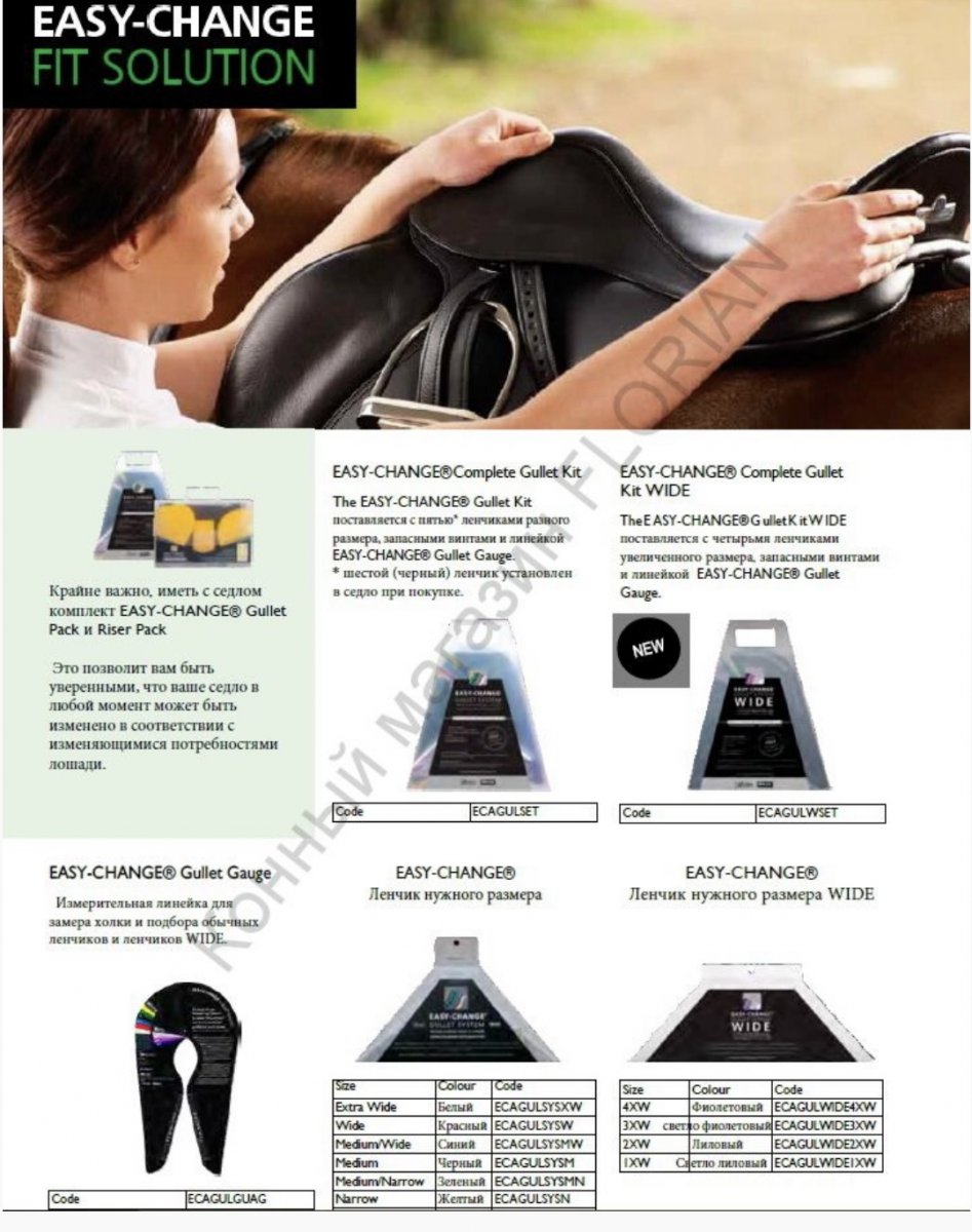 EASY CHANGE GULLET SYSTEM (система заменяемых ленчиков, регулирующих ширину передней луки седла) - ваша лошадь будет менять форму по мере взросления, от типа работы и уровня физической подготовки. EASY CHANGE GULLET SYSTEM позволяет быть уверенным, что седло подходит для текущей формы лошади.