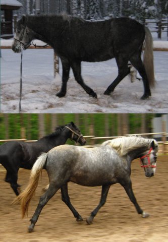 результат работы с молодой лошадью на вожжах. Наверху и внизу - рысь.