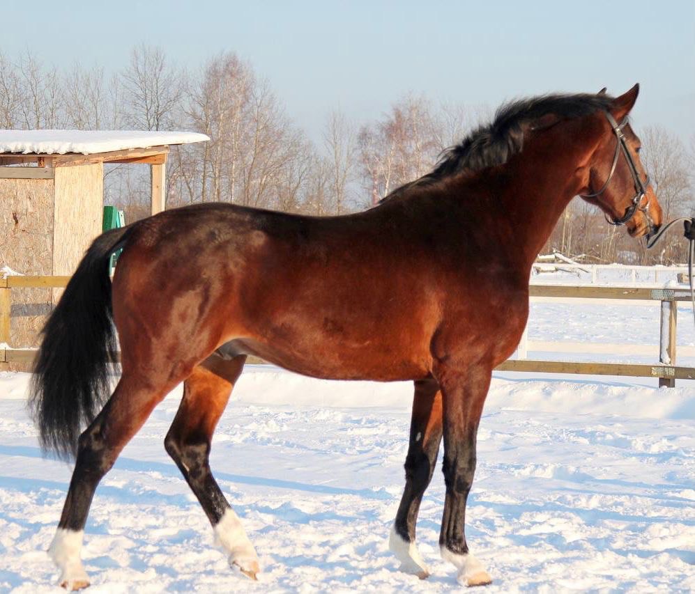 Шикарный жеребец ганноверской породы, гнедой масти. Шикарные крови, оба родителя линии Cor de la Bryere, в родословной такие громкие клички как Walerik, Landgraf, Calipso и Lord.