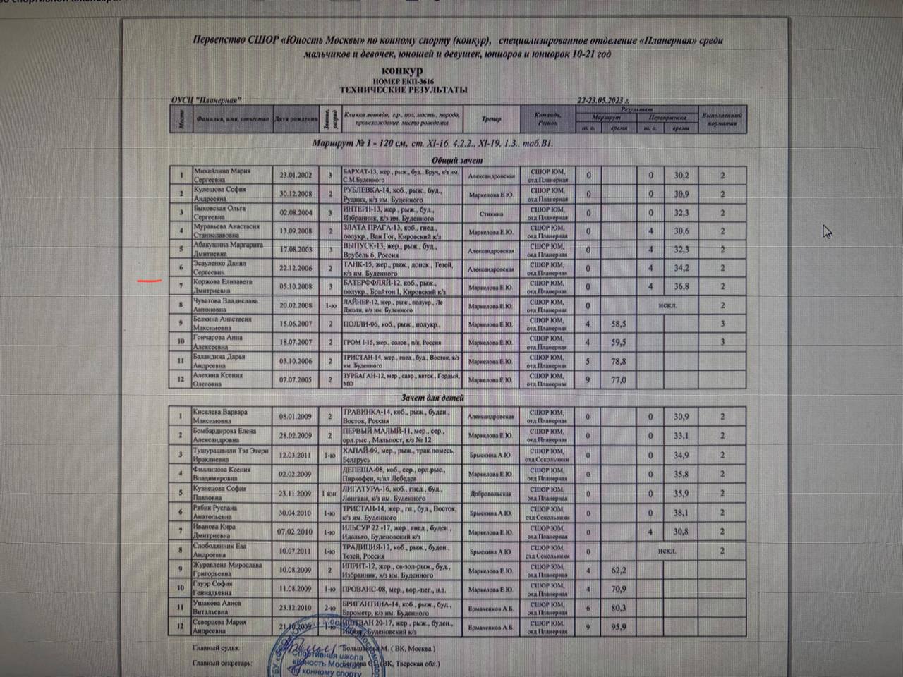 После нашего ухода, а так же ухода тренера, за спортивный сезон у Князевой О.Ю. обнаружилась нехватка выполнения разрядов учениками, поэтому всадники из троеборных групп выполняли разряды 1-й взрослый и КМС на вольтижировке. Соревнования по вольтижировке проводились на «Планерной» тренером-методистом «Юности Москвы», т.е. отследить подлинность проведения соревнований, их реальный уровень сложности не представляется возможным.
