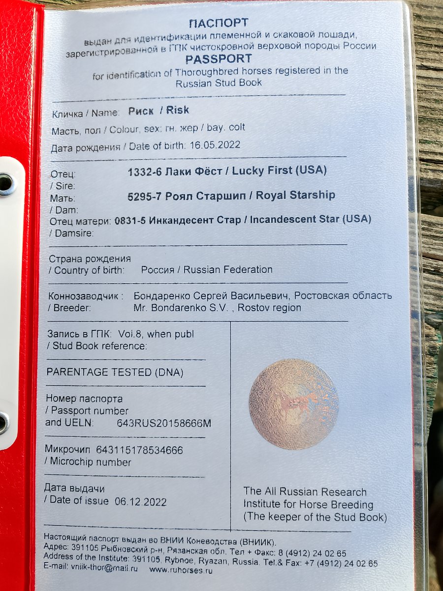Продается скаковой чкв жеребец Риск 2022г.р. от легендарного Лаки Феста USA ( победитель приза президента РФ)и Роял Старшип, отец матери Инкандесент Стар USA. Призовой жеребец, тяготеет к дальним дистанциям, 6 призовых мест. Абсолютно целый, находится в скаковом тренинге на Краснодарском ипподроме. 170-195-19. Без пороков, в дальнейшем будет классным производителем. Цена и видео по запросу 89034385939.