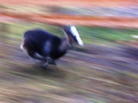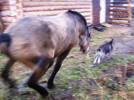 А вот взрослый конь иногда ее гоняет(хотя эту торпеду догнать сложно-она гораздо быстрее лошади скорость набирает-да и более маневренная)-когда не в духе,а обычно нет-тоже нейтрально относится.Так Даша сама его провоцирует на пробежку-перед мордой скачет-пока Лабик ее прогонять не начнет.