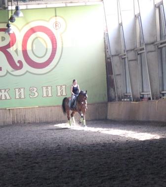 Сидится высоко и узко… На строевой рыси ощущение полета. Управляется сия машина четкими командами. Именно четкими и правильными, а не силою мысли)))) Очень интересная коняшка, но тяжелая (лично для меня, поскольку опыта пока еще маловато). В какие-то моменты мне казалось, что шея Димона сейчас сломается, причем в трех местах…Сидеть удобно, галоп удобный. Конечно, получалось не очень-то и хорошо и «в порыве страсти» я чуть не передавила пол манежа… Но покорило то, что Димон – как лакмусовая бумажка – сделал правильно-пошло, ошибся – не пошло. Все очень четко! Реальный такой пацан. Вышел, собрал шею, догнал чё делать – сделал! Не догнал – не сделал!))) Без лишних движений и метаний, как, например, Бал. У того тысяча движений и мыслей в секунду! С.С. взял нас на вольт и жутко ругался, когда из вольта мы умудрялись с Димоном сделать квадрат (он тянул на стенку, я в центр и с определенной периодичностью, кто-то кого-то перетягивал, вот и получался квадрат) Очень легко получилась менка. Вообще в начале все было гораздо пристойней, чем под конец, но я настолько устала с непривычки, что под конец уже еле держалась в седле.