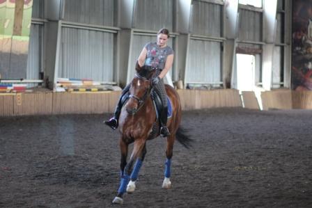 Итак, по-порядку. Коня вышла в манеж. Не успела я подобрать повод, а животинко уже само собралось шагает так себе активненько, ушками слушает, мол, может пора сделать что-нибудь....Размялись, и как давай галопом шпарить...и по стенке, и на вольту гнемся, и менки во все стороны пожалуйста...И это при том, что я одела неудобные бриджи и майку, поэтому мысли мои были только о том, как прикрыть декольте и подтянуть штаны, в которых сидеть жутко неудобно