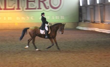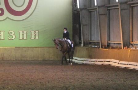 Попытка собрать коня по стенке не удалась, поэтому сделав вольт мы выехали на приветствие. Видимо, чтобы ускорить весь этот процесс, вместо рыси, конь начал галоп :not: . Быстро перевела в рысь. Прибавка получилась хорошей, вольты тоже вроде ровненькие. Наш серпантин судьи обозвали квадратным, поэтому много не поставили... :roll: