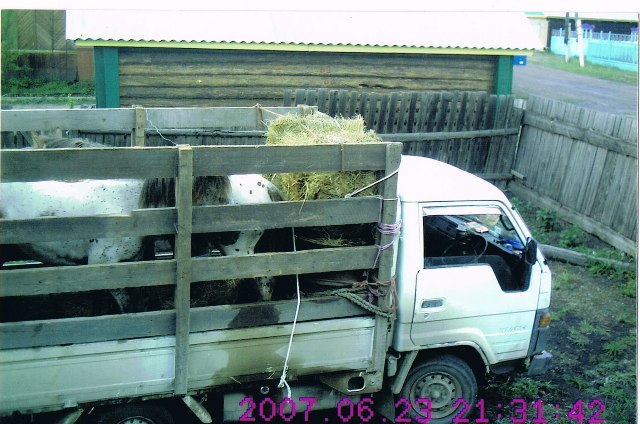 Первым повели жеребчика, чуть подурил и все так же кругом , по спирали спустились к машине , а там видя его сопротивление , ребята перебросили веревку за брус около кабины и стали его подтягивая , затаскивать в кузов . Чубарик попытался вывернутся в сторону , но ловко схваченный за хвост , был прсто задернут передом на кузов , а там и сам прошел. Его коротко привязали и пошли , я заахала и заохала , испугавшись , что жеребчик оборвет таки привязь и удерет , но Бадма успокоил ...