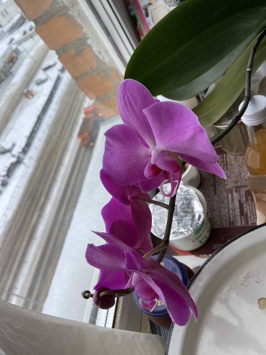 А еще у меня к НГ подарочек. Зацвела мелкая фиолетовая орхидея, которую я спасла с помоечки. Она год в себя не могла прийти, потом долго стояла с нераскрытыми бутонами, а 1 января вот выдала.