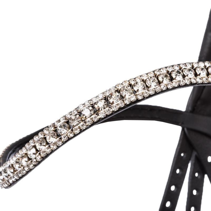 Капсюль украшен кожаными декоративными элементами по бокам, а налобный ремень украшен красивыми кристаллами.